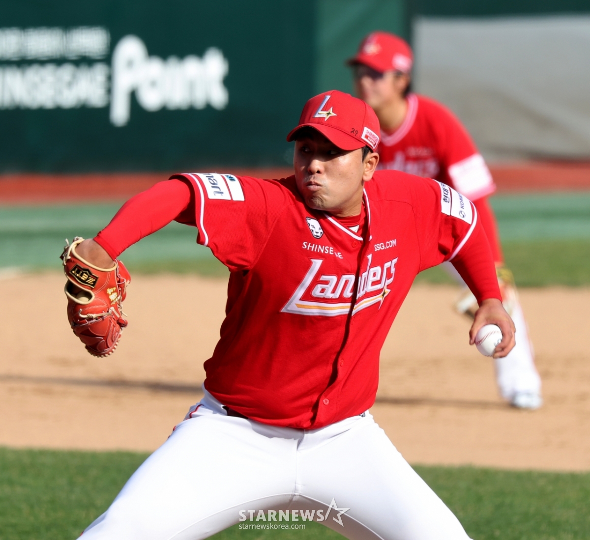 *此内容由AI翻译生成。29日,在仁川SSG兰德斯球场举行的2026职业棒球SSG兰德斯队与起亚虎队的比赛第7回合初,兰德斯左腕投手金泽亨正在奋力投球。 2026.03.29.© STARNEWS. 未经许可禁止转载或再分发*此内容由AI翻译生成。