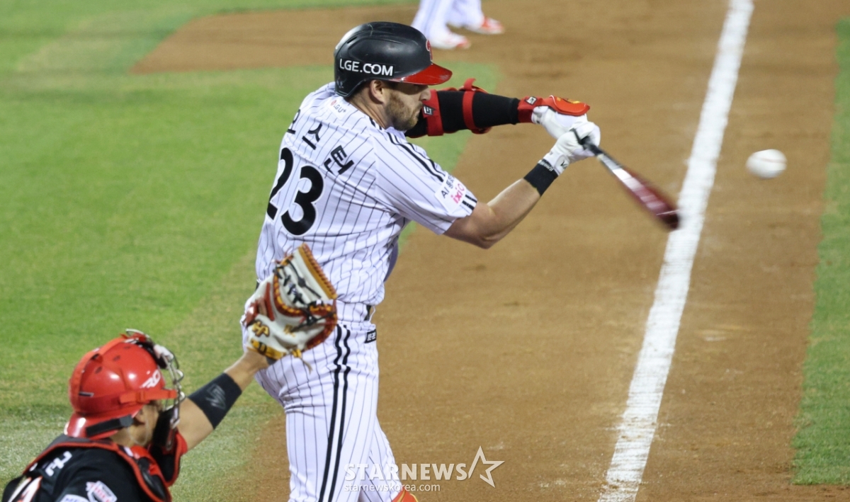 *此内容由AI翻译生成。1日,2026新韩SOL Bank KBO联赛LG双子队对KIA老虎队的比赛在首尔蚕室棒球场举行。图为,LG奥斯汀在第6回合末1人出局满垒的情况下,击出了牺牲1打点的腾空球。© STARNEWS. 未经许可禁止转载或再分发*此内容由AI翻译生成。