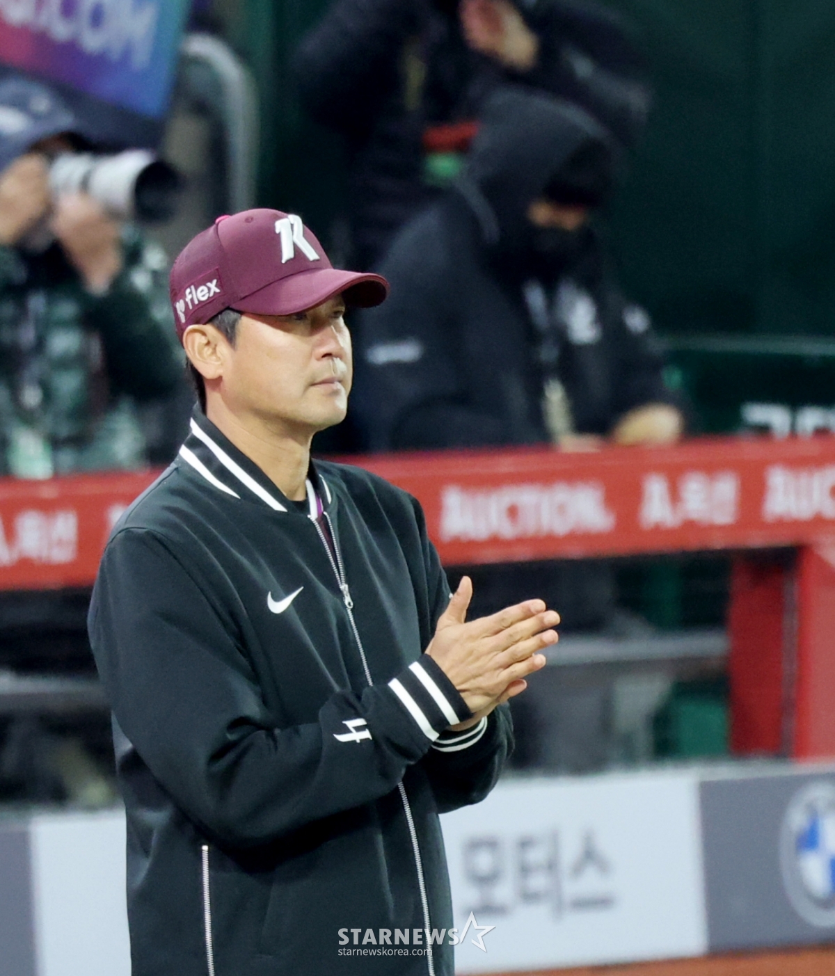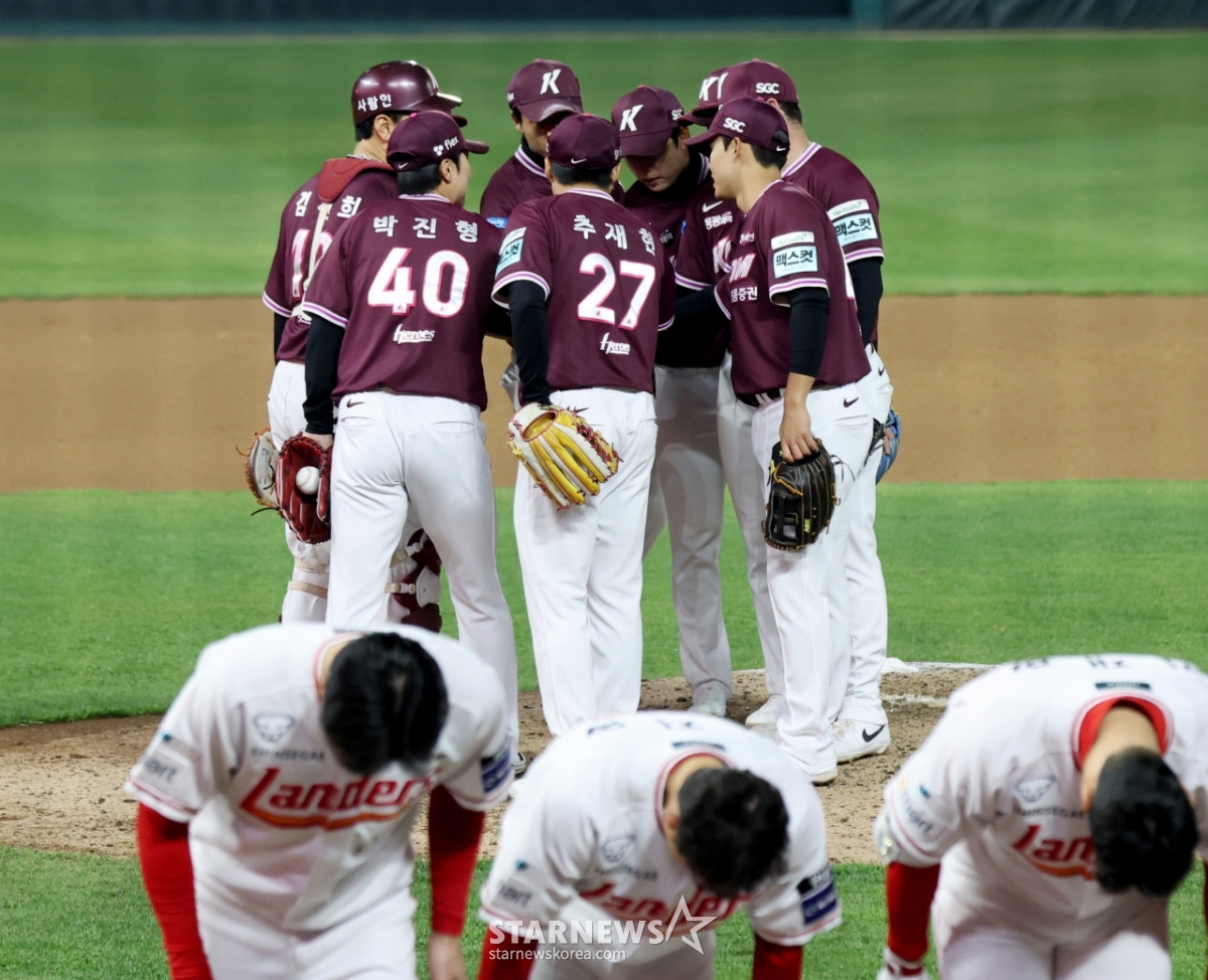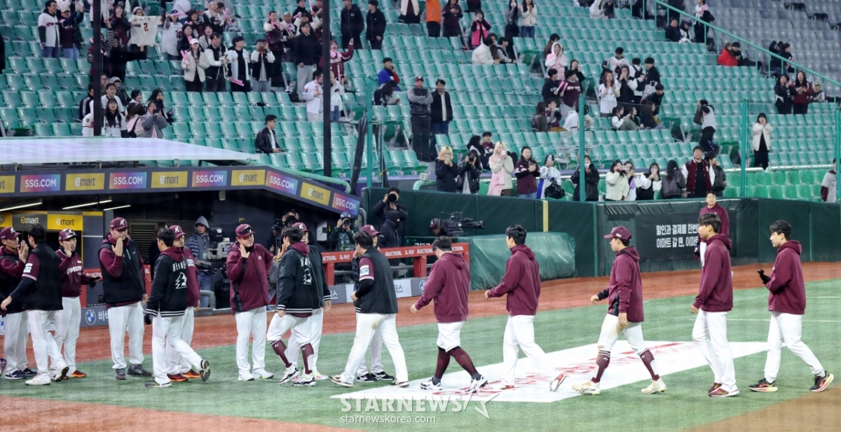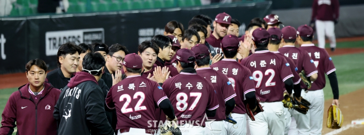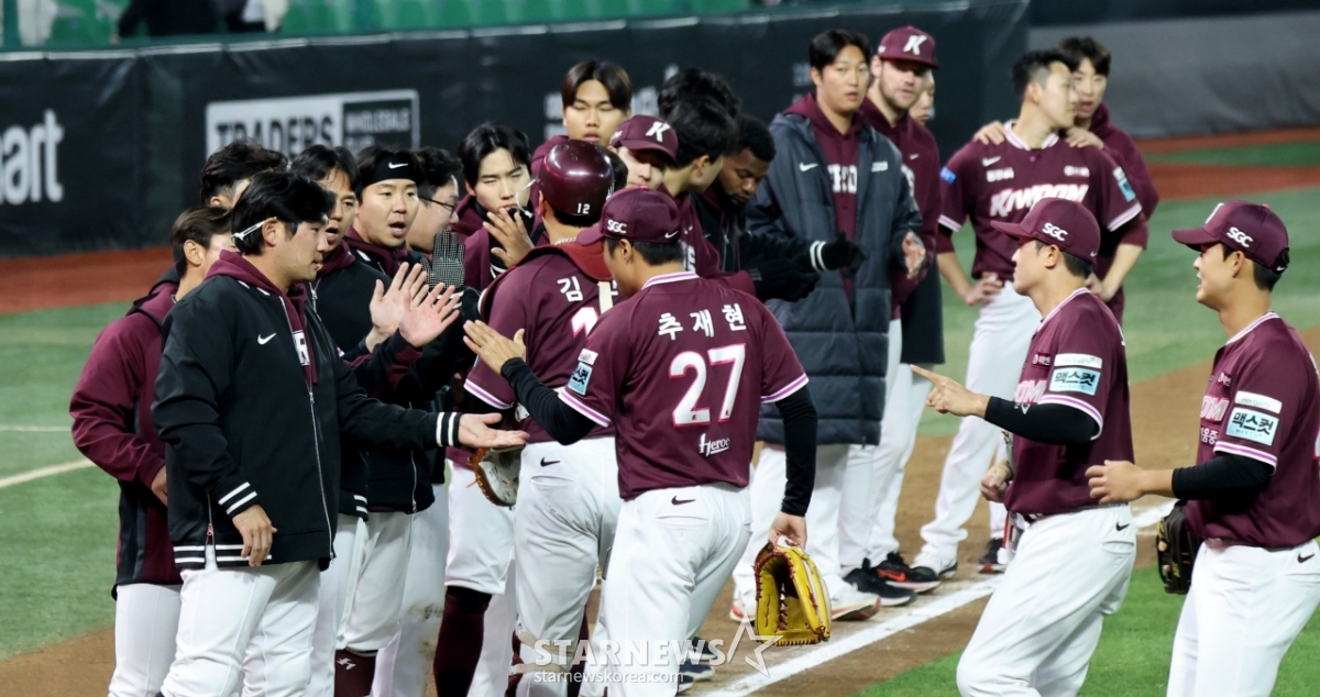 *此内容由AI翻译生成。1日,在仁川SSG兰德斯球场举行的2026职业棒球SSG兰德斯和Kiwoom Heroes的比赛中,Kiwoom Heroes的选手们获胜后正在庆祝。 2026.04.01.© STARNEWS. 未经许可禁止转载或再分发*此内容由AI翻译生成。