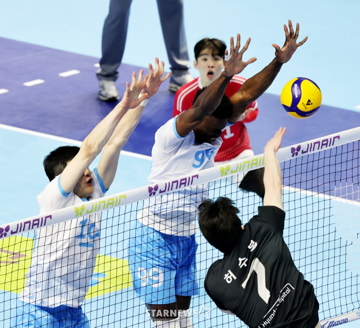 *此内容由AI翻译生成。3日,在桂阳体育馆举行的真航空2025-2026 V联赛冠军争夺战大韩航空队和现代资本队的比赛中,现代许秀峰避开Masso拦网,正在成功进攻。 2026.04.03.© STARNEWS. 未经许可禁止转载或再分发*此内容由AI翻译生成。