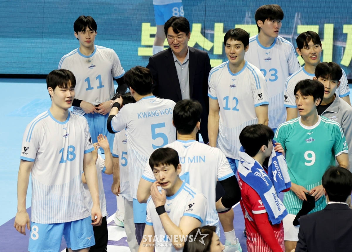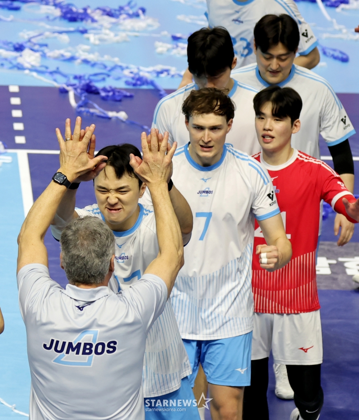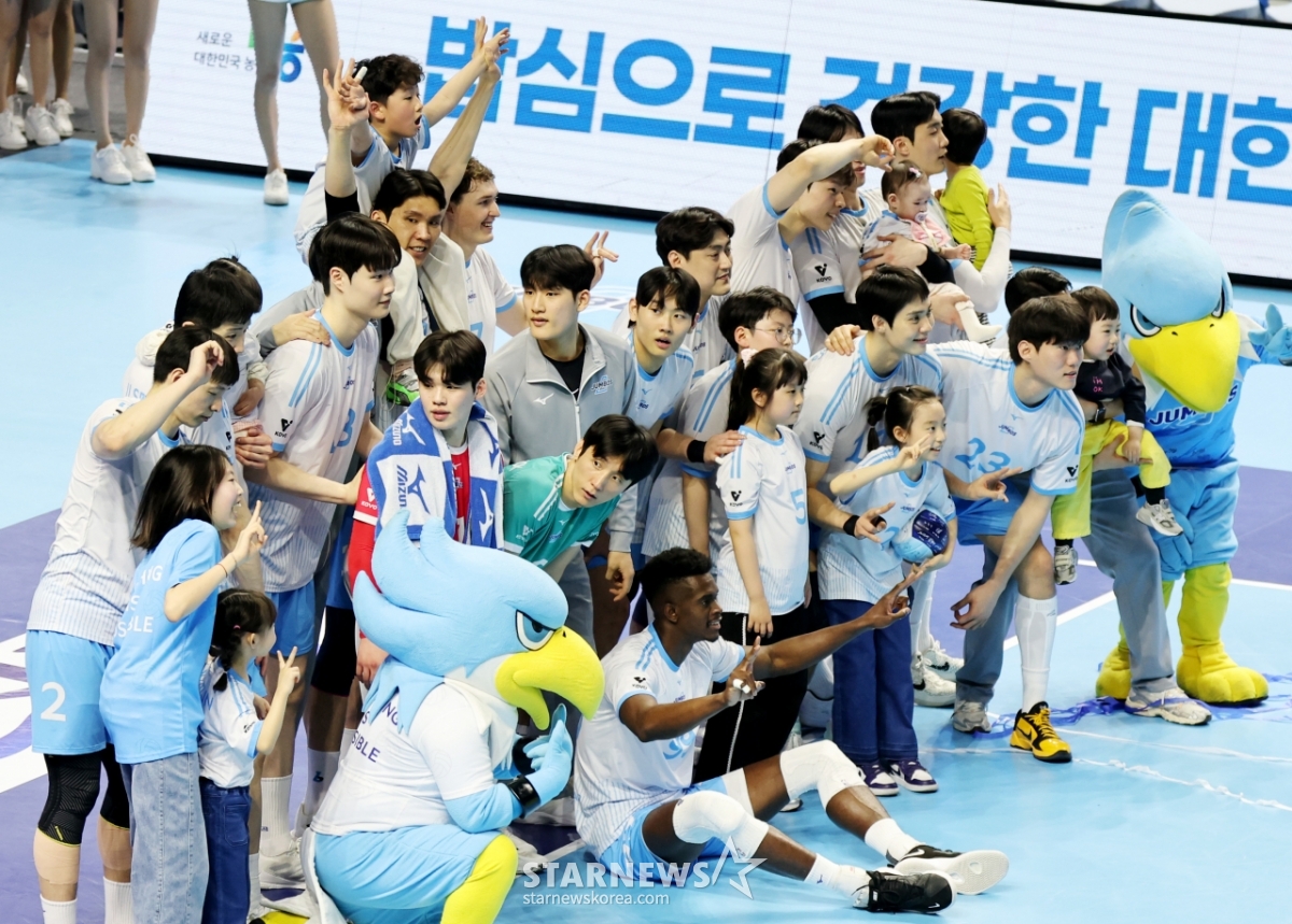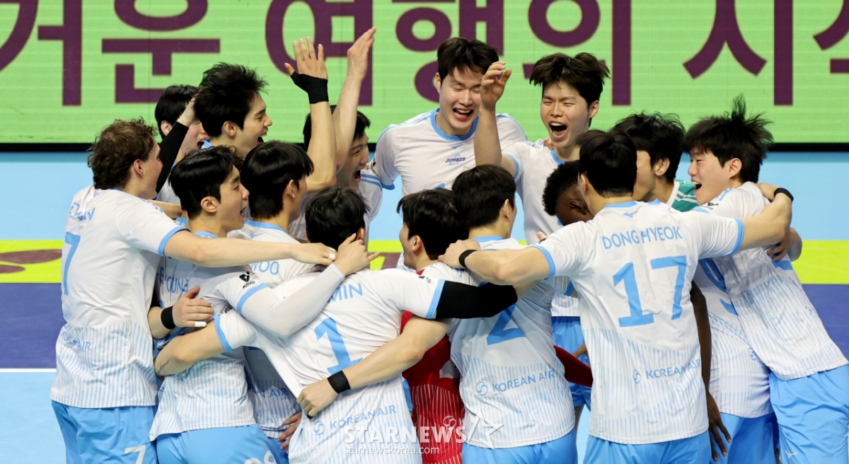 3日,大韩航空选手们在桂阳体育馆举行的真航空2025-2026 V联赛冠军争夺战中,大韩航空队和现代资本队赢了5局,登上了有利于夺冠的高地后,正在享受喜悦。 2026.04.03.