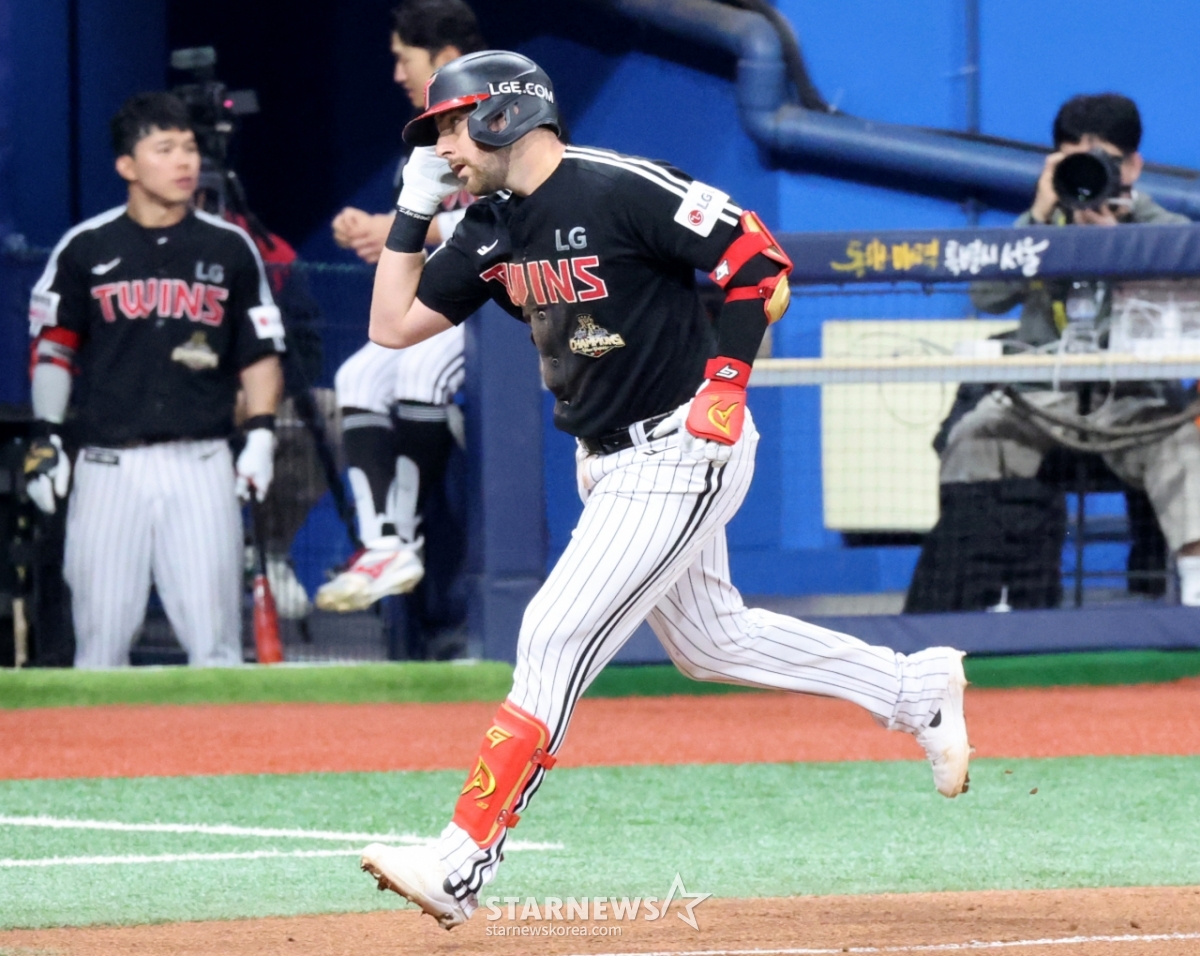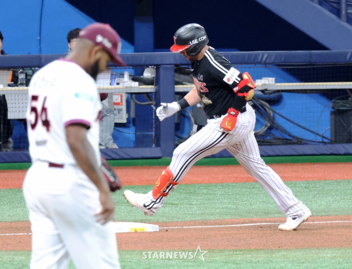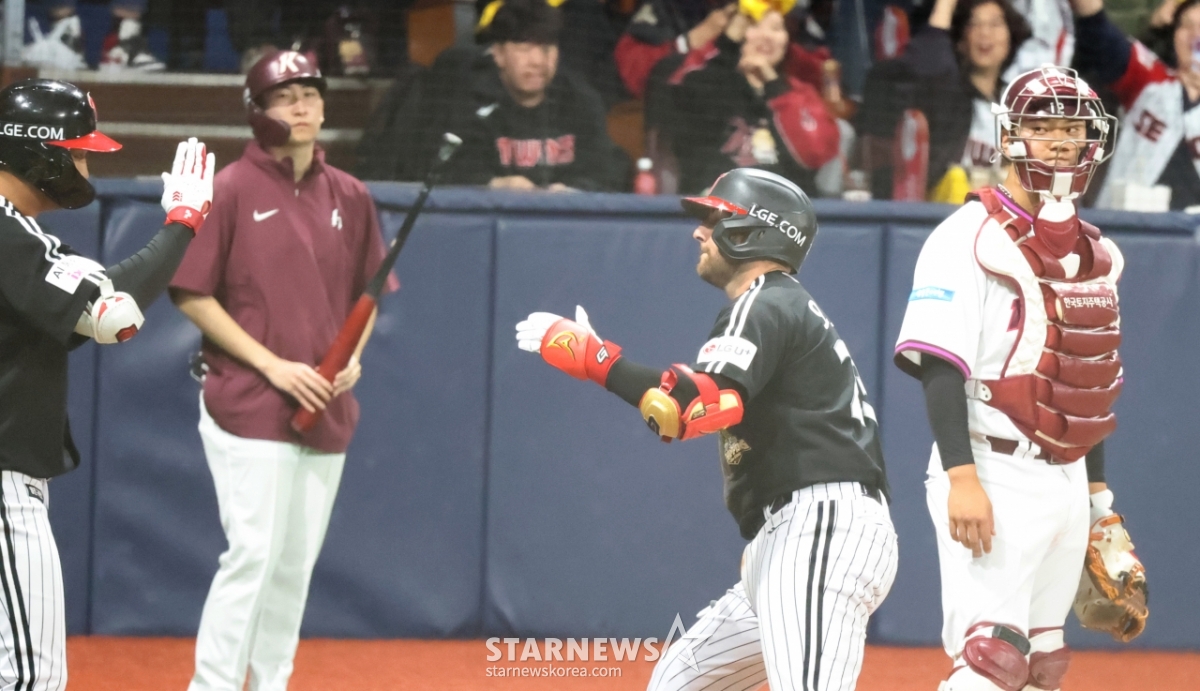 *此内容由AI翻译生成。4日,LG队4号击球手奥斯汀在高尺天空巨蛋体育场举行的2026KBO联赛Kiwoom Heroes队与LG Twins队的比赛第4回合初,面对阿尔坎塔拉击出追击单打本垒打后,正在本垒打。 202604.03.© STARNEWS. 未经许可禁止转载或再分发*此内容由AI翻译生成。
