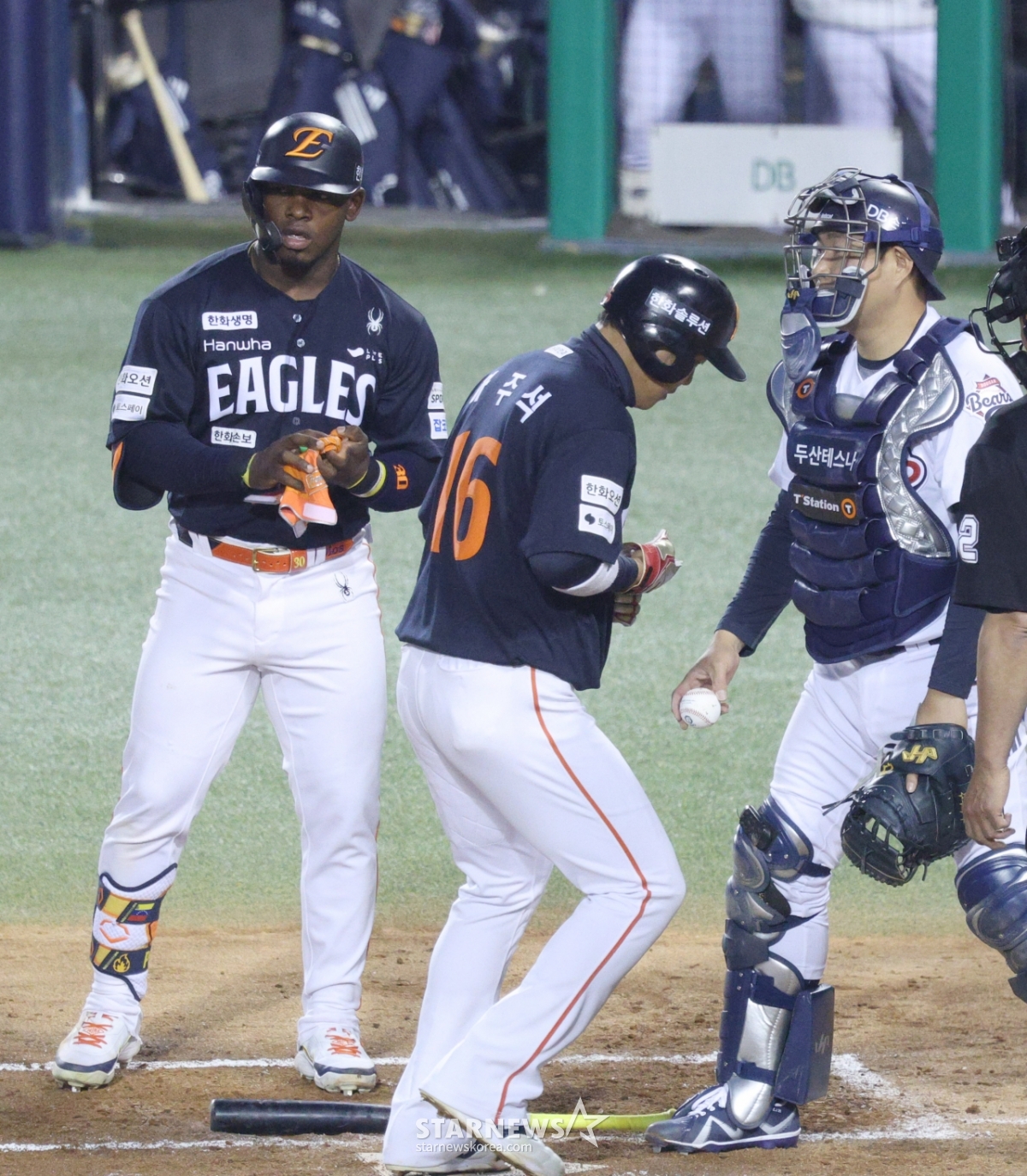 *此内容由AI翻译生成。3日,2026新韩SOL KBO联赛斗山熊队对韩华老鹰队的比赛在首尔蚕室棒球场举行。韩华Ferraza队在第2回合初2人出局满垒的情况下,选择了四坏球上垒,图为3垒手河柱锡正在得分。© STARNEWS. 未经许可禁止转载或再分发*此内容由AI翻译生成。