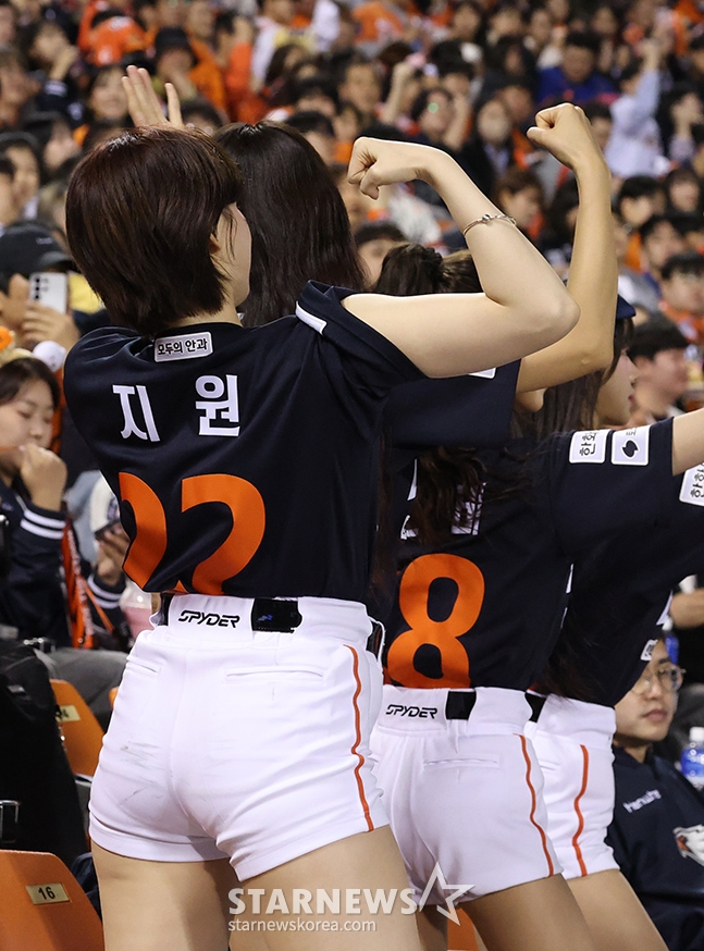 图为韩华啦啦队队长河智苑(音)正在热情助威。