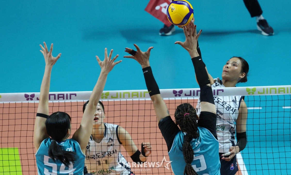 *此内容由AI翻译生成。5日,在首尔奖忠体育馆举行了2025-2026 V-联赛季后赛女子职业排球冠军争夺战第3场比赛GS加德士对韩国道路公社的比赛。韩国道路公社Tanacha队因GS加德士席尔瓦的拦网被挡住,正在连续打出好球。© STARNEWS. 未经许可禁止转载或再分发*此内容由AI翻译生成。