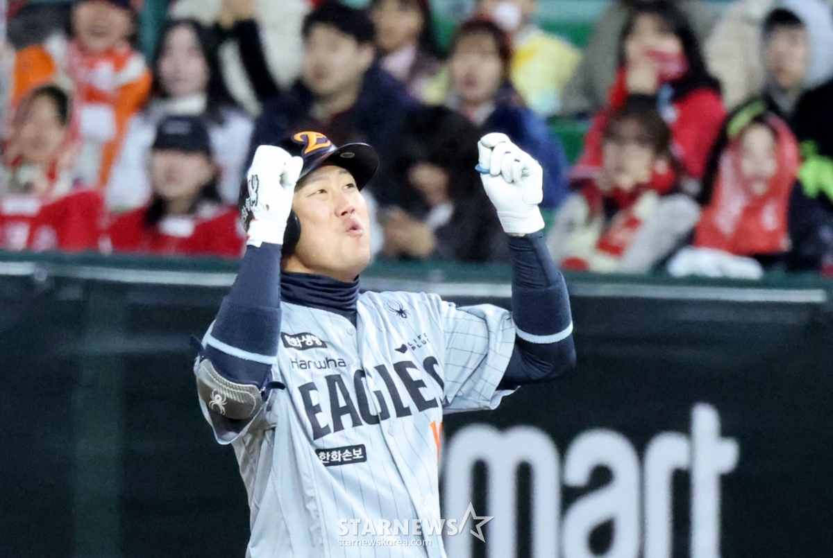 7日,韩华河主席在兰德斯球场举行的2026KBO联赛韩华老鹰队与SSG兰德斯赛季首场比赛第3回合初,在2人出局满垒的情况下,击出2分适时安打后正在欢呼。 2026.04.07.