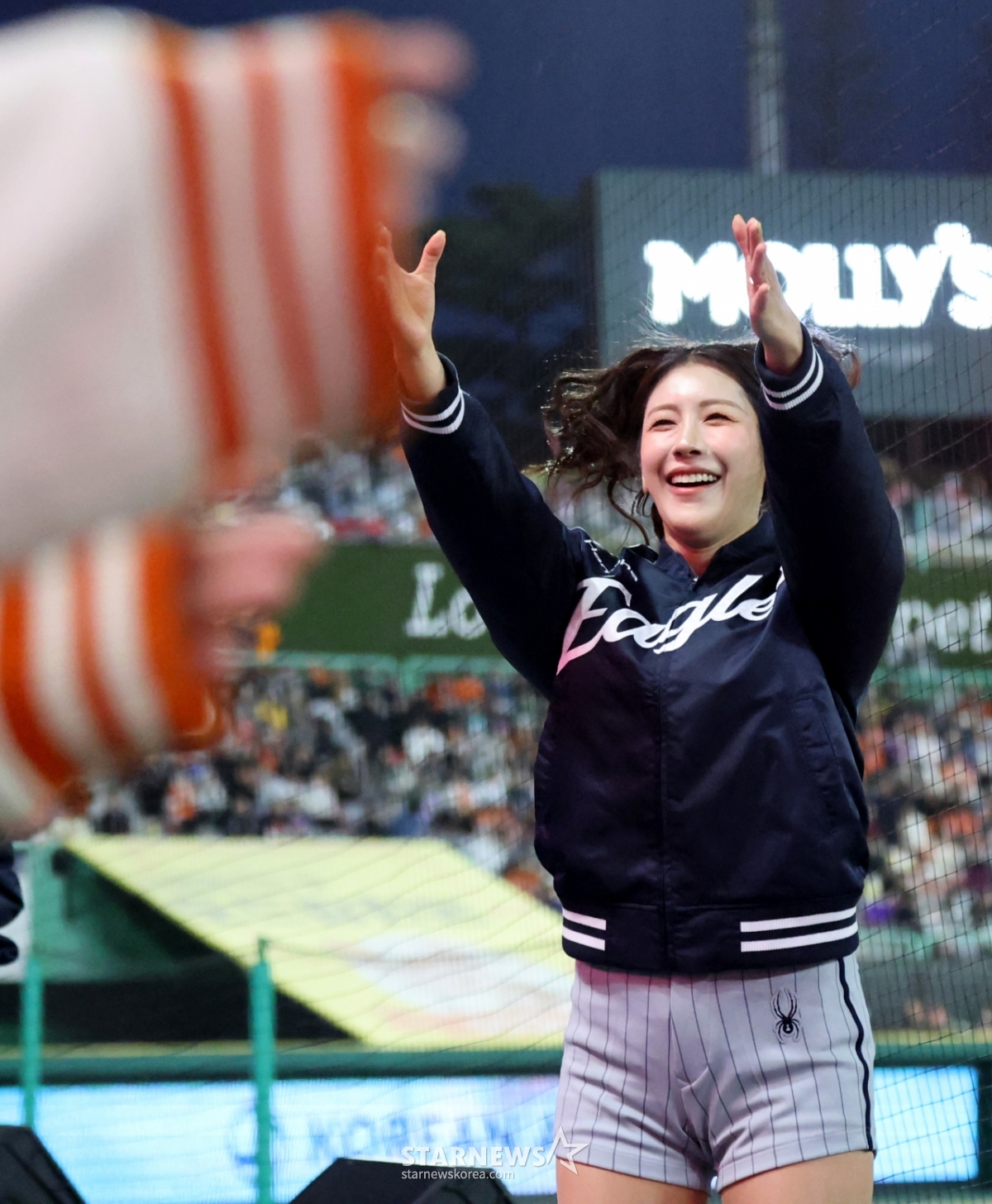 7日,韩华河主席在兰德斯球场举行的2026KBO联赛韩华老鹰队与SSG兰德斯赛季首场比赛第3回合初,在2人出局满垒的情况下,击出2分适时安打后正在欢呼。