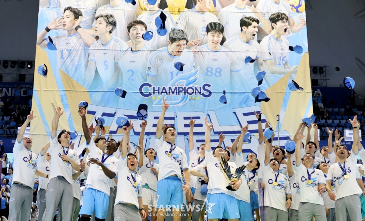 MVP郑智锡和大韩航空选手们10日在仁川桂阳体育馆举行的真航空2025-2026 V联赛冠军争夺战大韩航空和现代资本第5场比赛中获胜,夺冠后摘下冠军帽子庆祝。 2026.04.10.