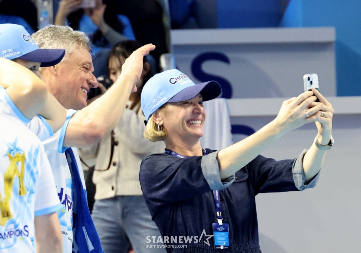 10日,在仁川桂阳体育馆举行的真航空2025-2026 V联赛冠军争夺战中与大韩航空队进行的现代资本队第5场比赛中获胜并夺冠后,河南队主教练正在与妻子进行视频通话。 2026.04.10.