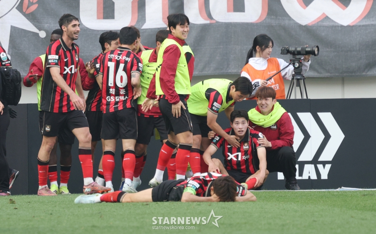 FC首尔队的克里马拉在下半场结束前攻入制胜一球后,金镇洙趴在地上激动不已。