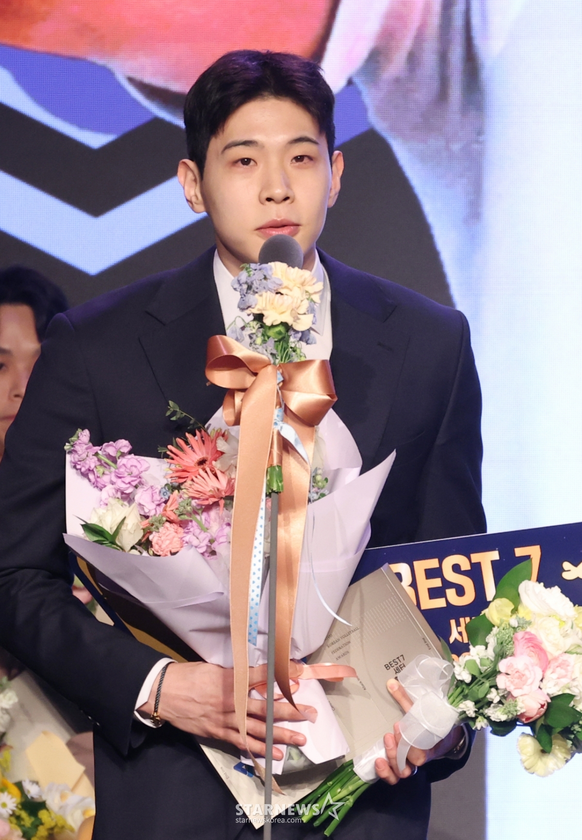图为黄承彬(现代capital)在获得"最佳7人奖"后发表感想。