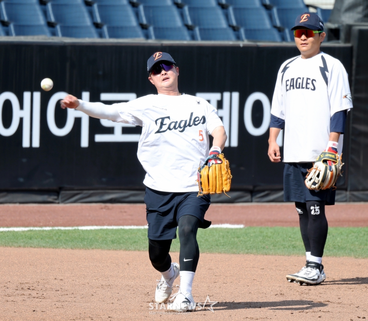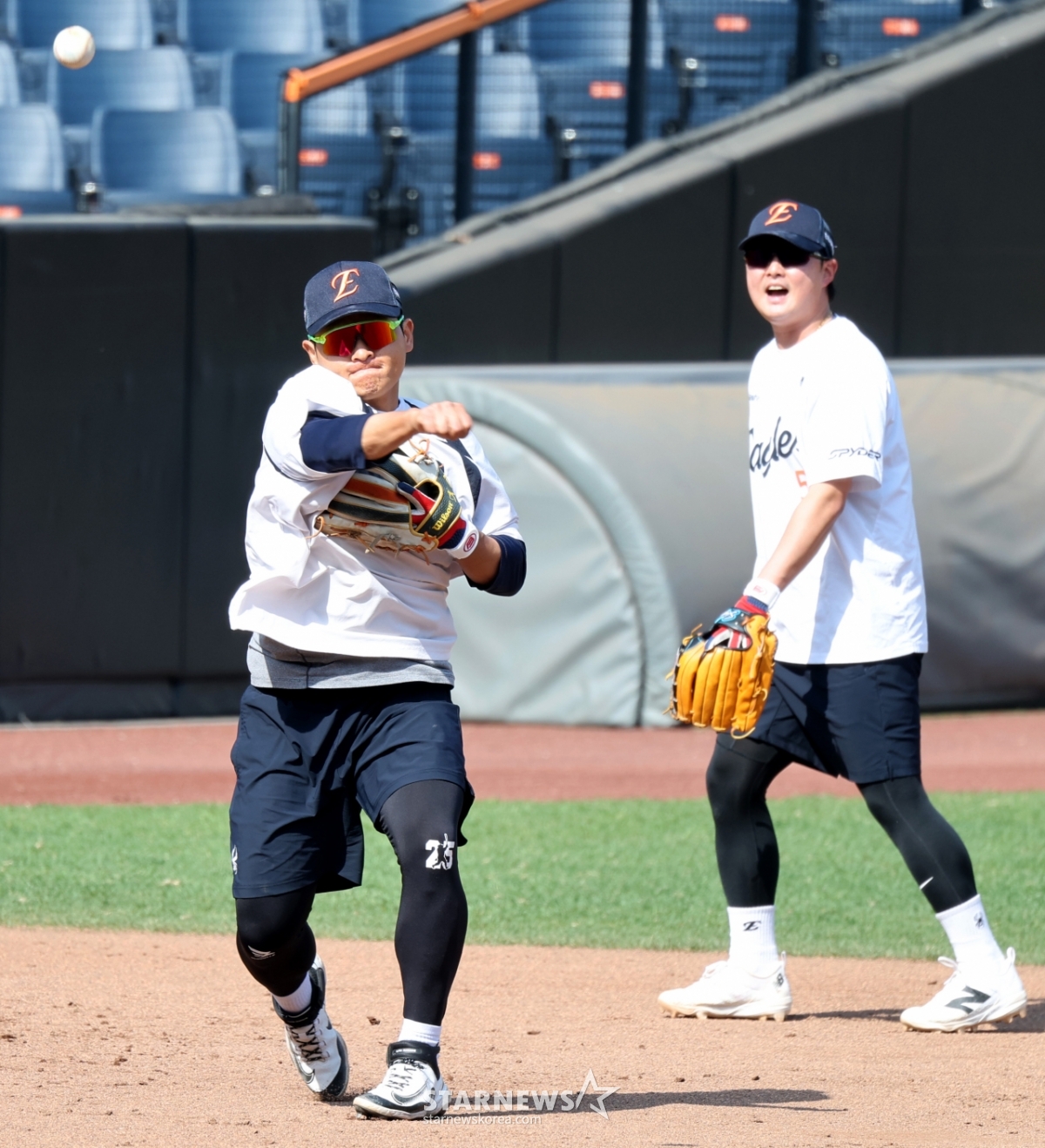 韩华金泰妍和李道允15日在大田韩华生命球场举行的2026KBO联赛韩华老鹰队和三星狮子队比赛前夕,正在进行卢时焕空出的3垒防守训练。 2026.04.15.