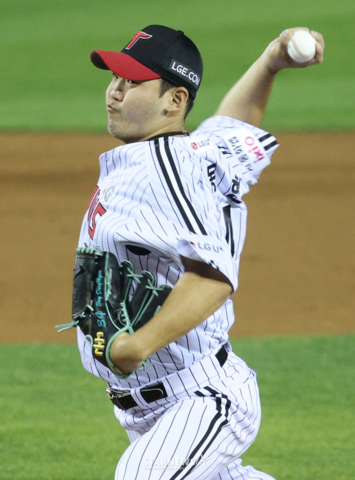 *此内容由AI翻译生成。15日,2026新韩SOL KBO联赛LG双子队对乐天巨人队的比赛在首尔蚕室棒球场举行。LG队的成东铉正在奋力投球。© STARNEWS. 未经许可禁止转载或再分发*此内容由AI翻译生成。