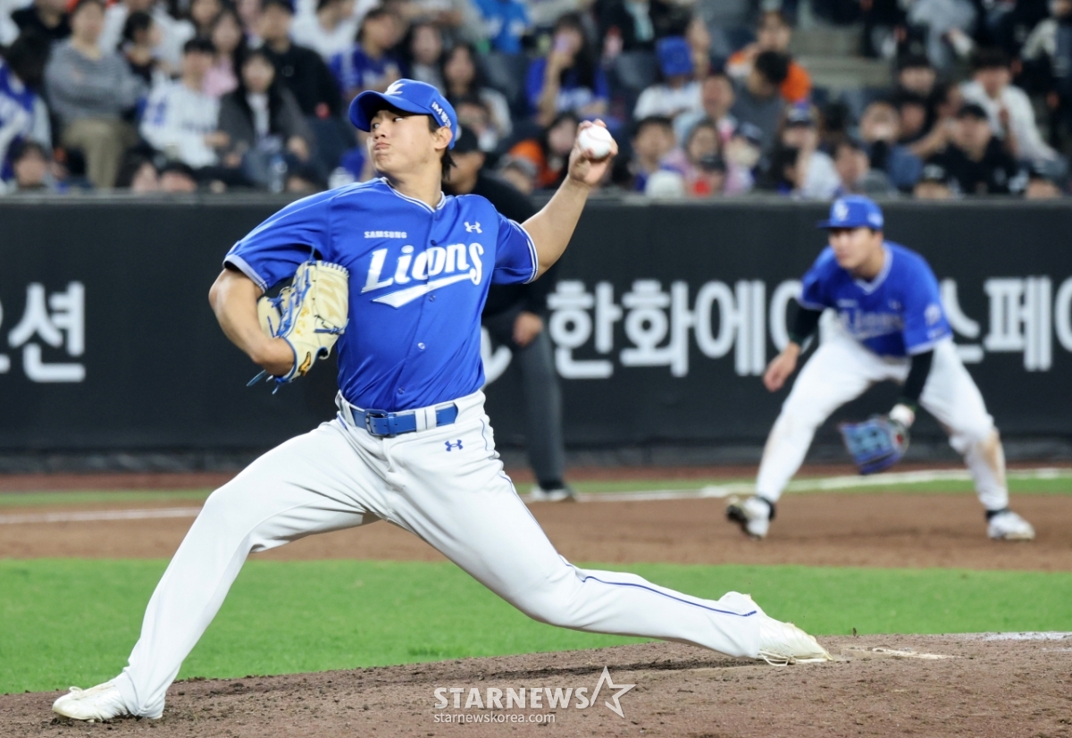 5日,三星左腕投手裴灿胜(音)在大田韩华生命球场举行的2026KBO联赛韩华老鹰队与三星狮子队比赛的第7回合末,以无失分的成绩挡住了比赛。 2026.04.15.