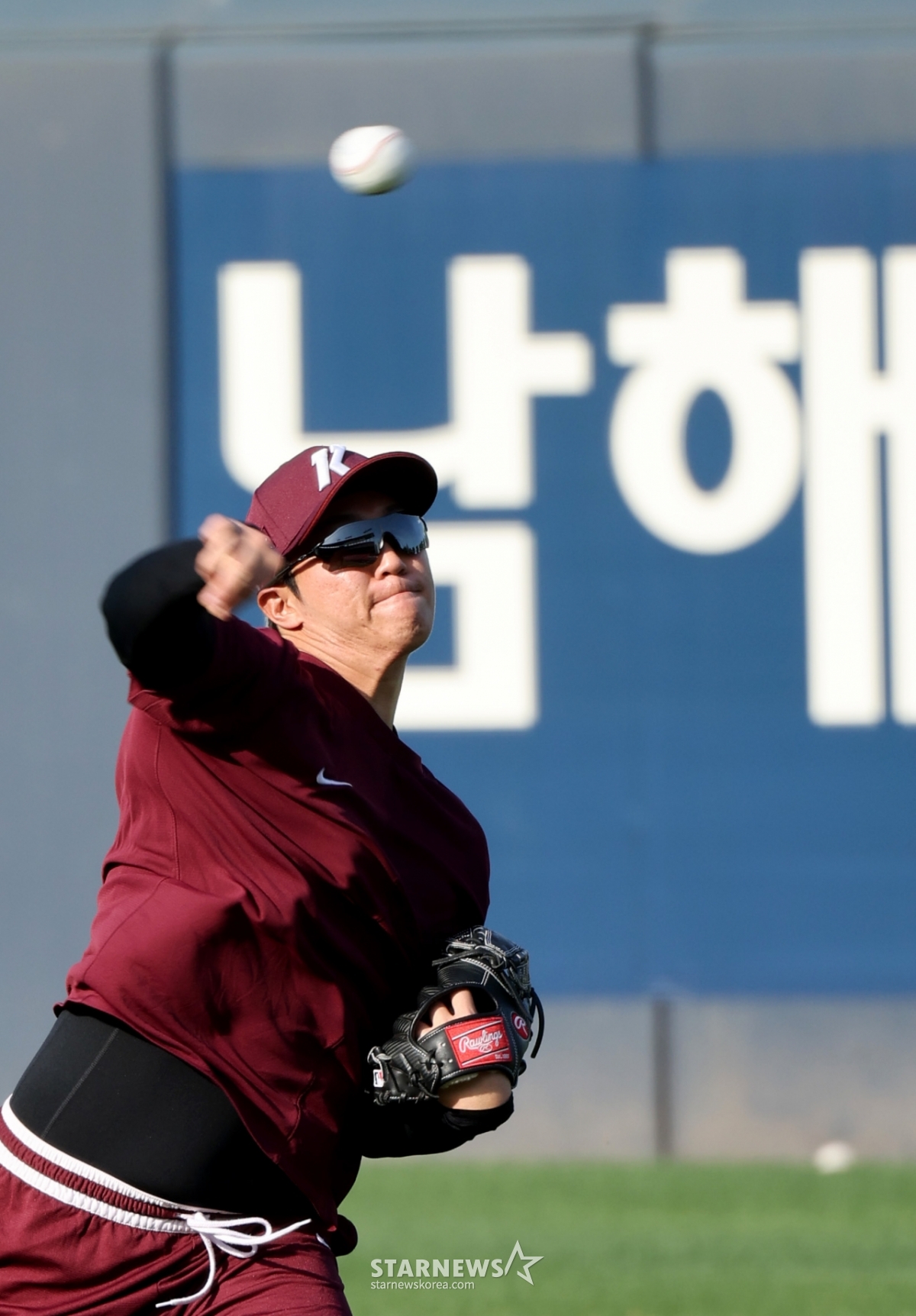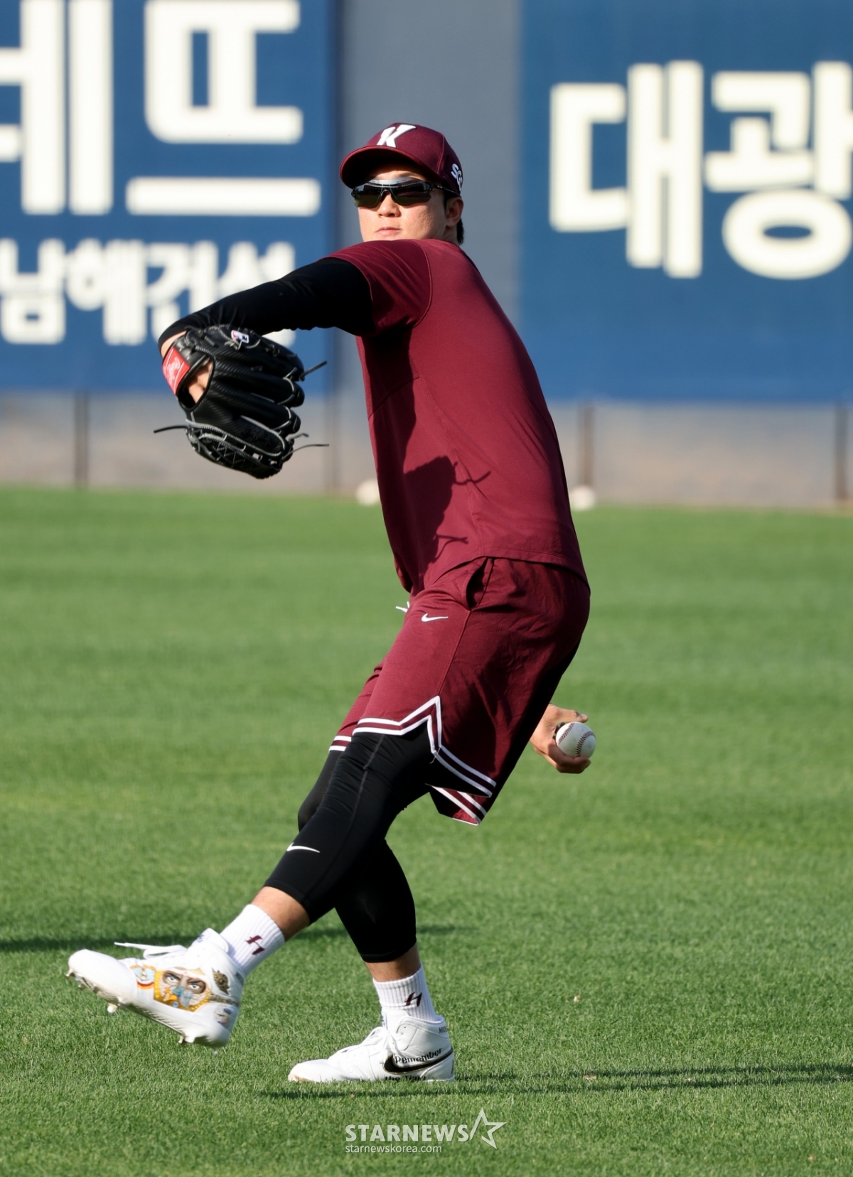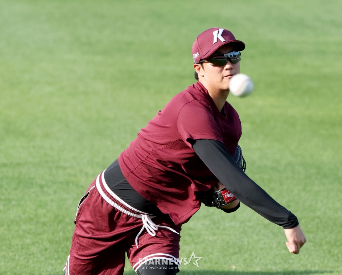 16日,在光州KIA冠军球场举行的2026KBO联赛起亚老虎队和Kiwoom Heroes队的比赛前夕,受伤提前复出的安佑镇正在外野投球热身。 2026.04.16.