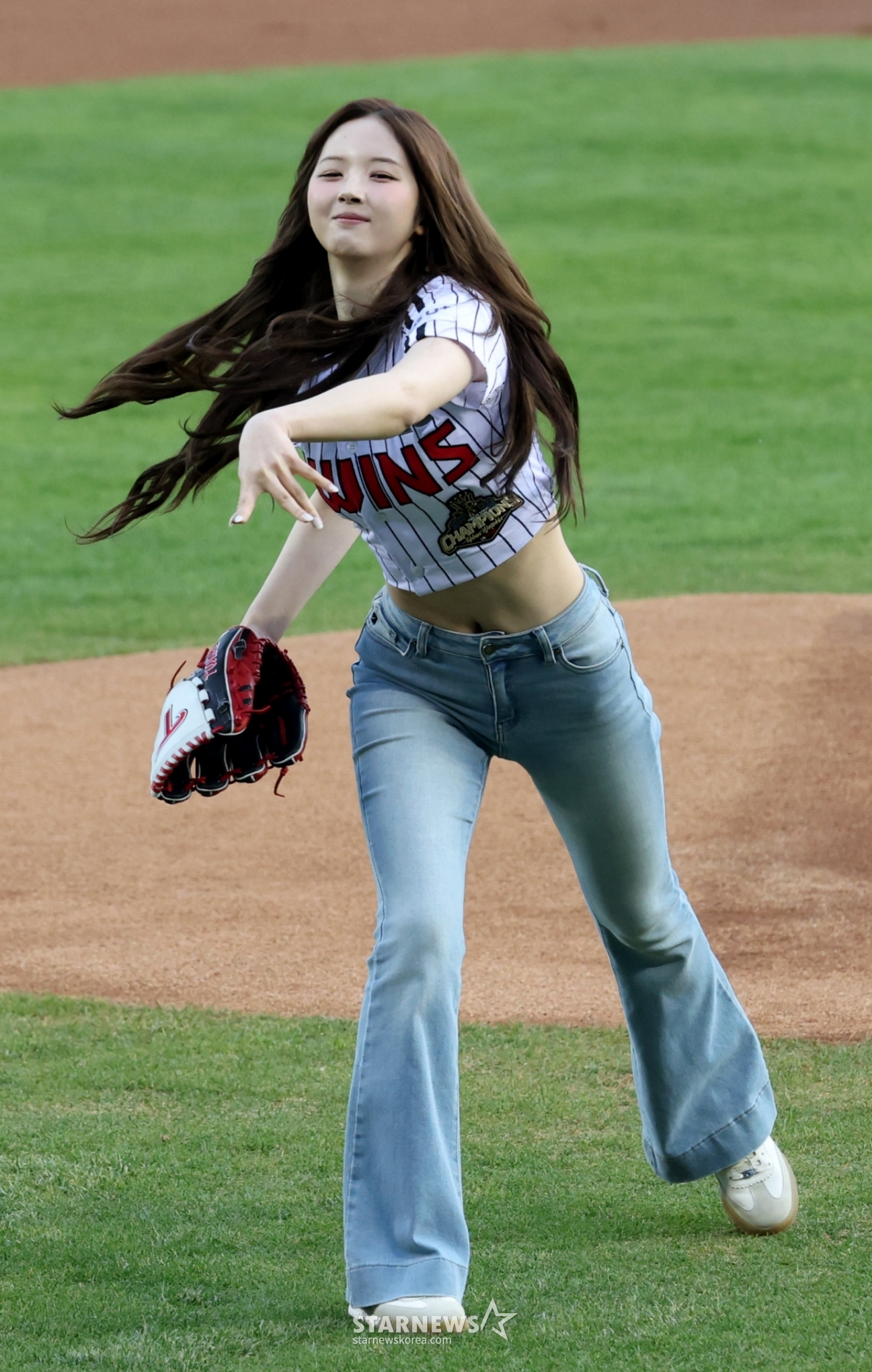 组合TripleS成员李智宇正在为LG胜利开球。 击球手由郑河妍担任。
