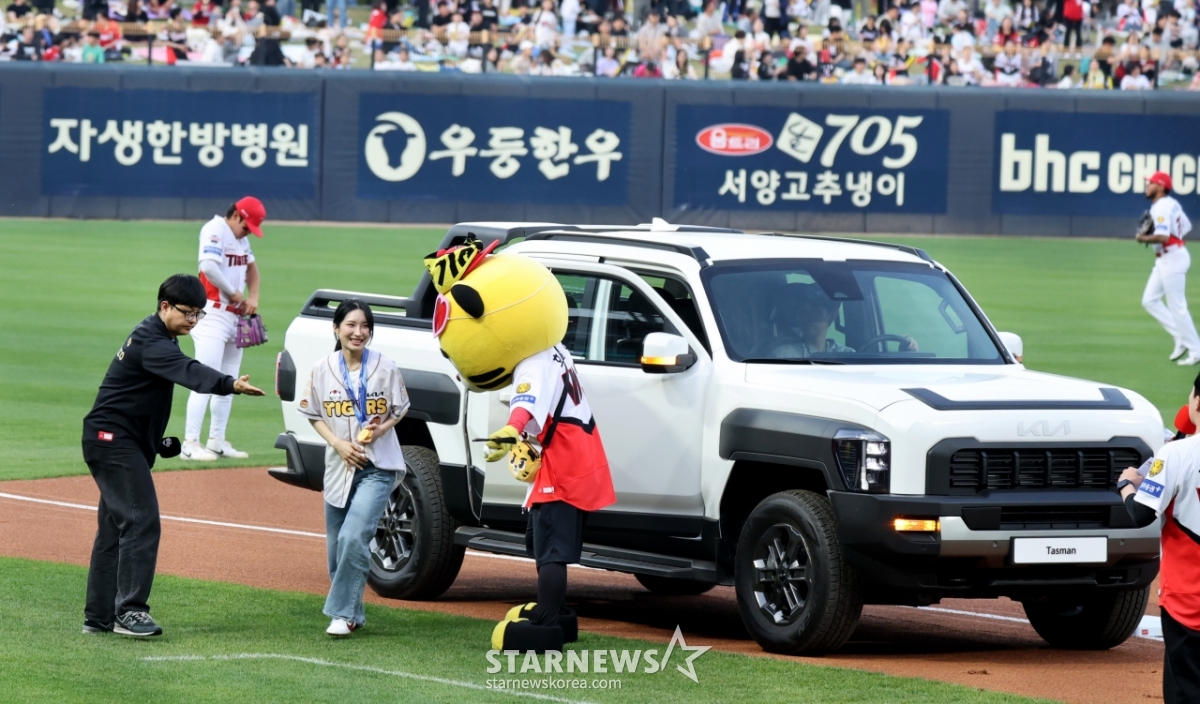 16日,冬奥会短道速滑金牌得主兰博基利•金吉利为了宣布在光州KIA冠军球场举行的2026KBO联赛起亚老虎队和Kiwoom Heroes队的比赛开始的开球,正在下车。2026.04.16.