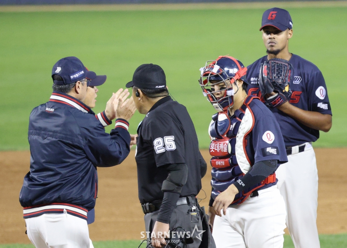 乐天队的首发投手罗德里格斯出现动摇后,金相镇教练立即走上投手踏板,稳定情绪。