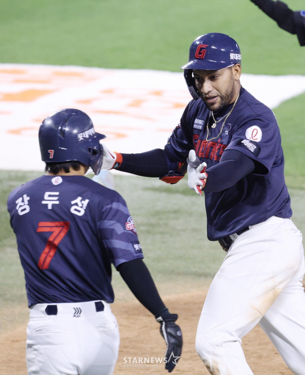图为,乐天Rayes队在第6回合初在2人出局1人在垒的情况下,面对LG队的张炫植击出扳平比分的2分本垒打。