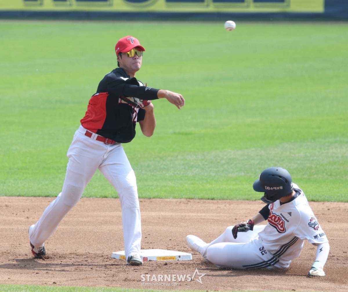图为在斗山队第1回合末无人出局满垒的情况下,1柳跑垒员朴俊顺(音)在梁义智的内野地滚球时在2垒出局。 处理双杀的KIA2垒手是金奎成。
