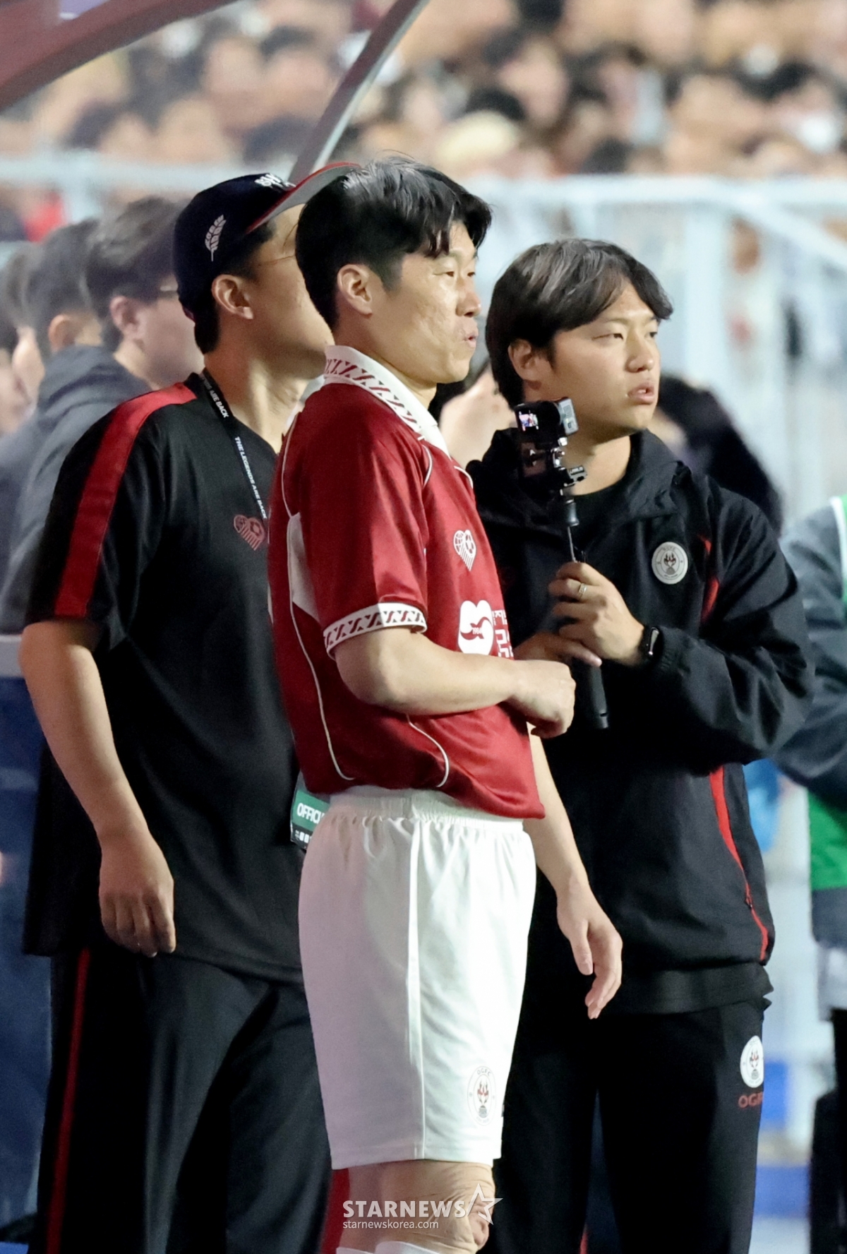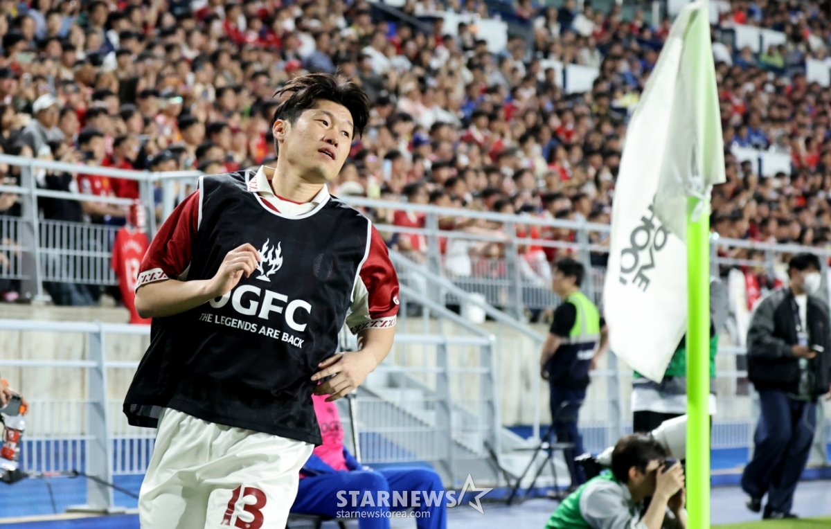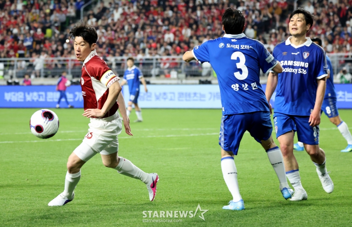 19日,在水原世界杯体育场举行的OGFC和水原三星的传奇对决下半场替换上场后,OGFC朴智星立即利用边路突破创造了机会。 2026.04.19.