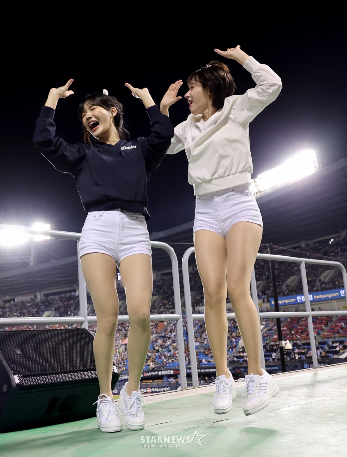 23日,在蚕室棒球场举行的2026 KBO联赛LG双子队和韩华老鹰队的比赛中,从乐天队转会到韩华队的啦啦队队员崔洪罗与河智苑展开了激烈的舞台表演。 2026.04.23.