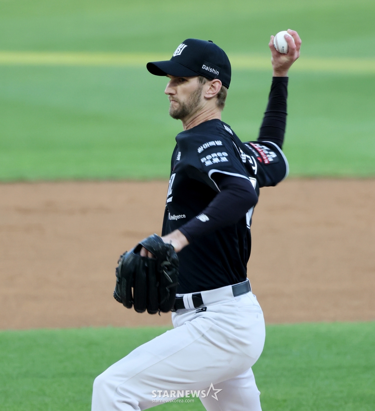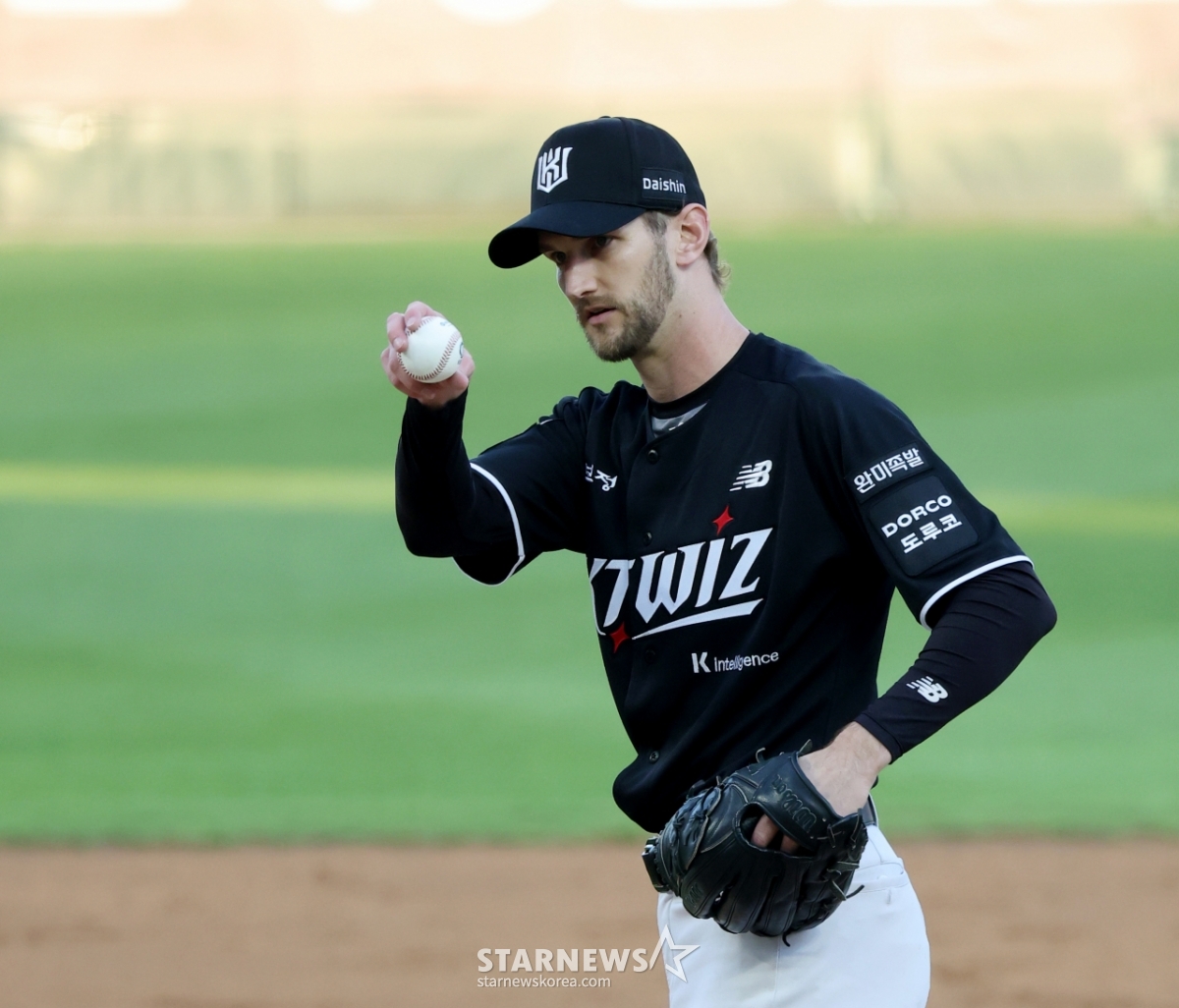 KT右腕投手博什利24日在兰德斯球场举行的2026KBO联赛SSG兰德斯队和KT Wiz队的比赛中首发出场,正在奋力投球。 博什利在第1回合末失2分。 2026.04.24.