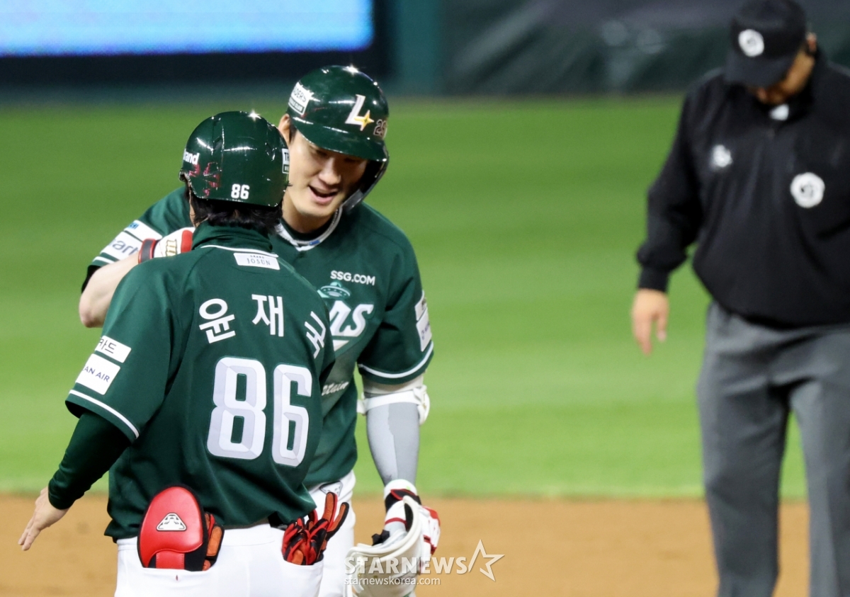 24日,兰德斯队吴泰坤在兰德斯球场举行的2026KBO联赛SSG队与KT Wiz队的比赛第5回合末击出1分适时安打后,正在庆祝。 2026.04.24.