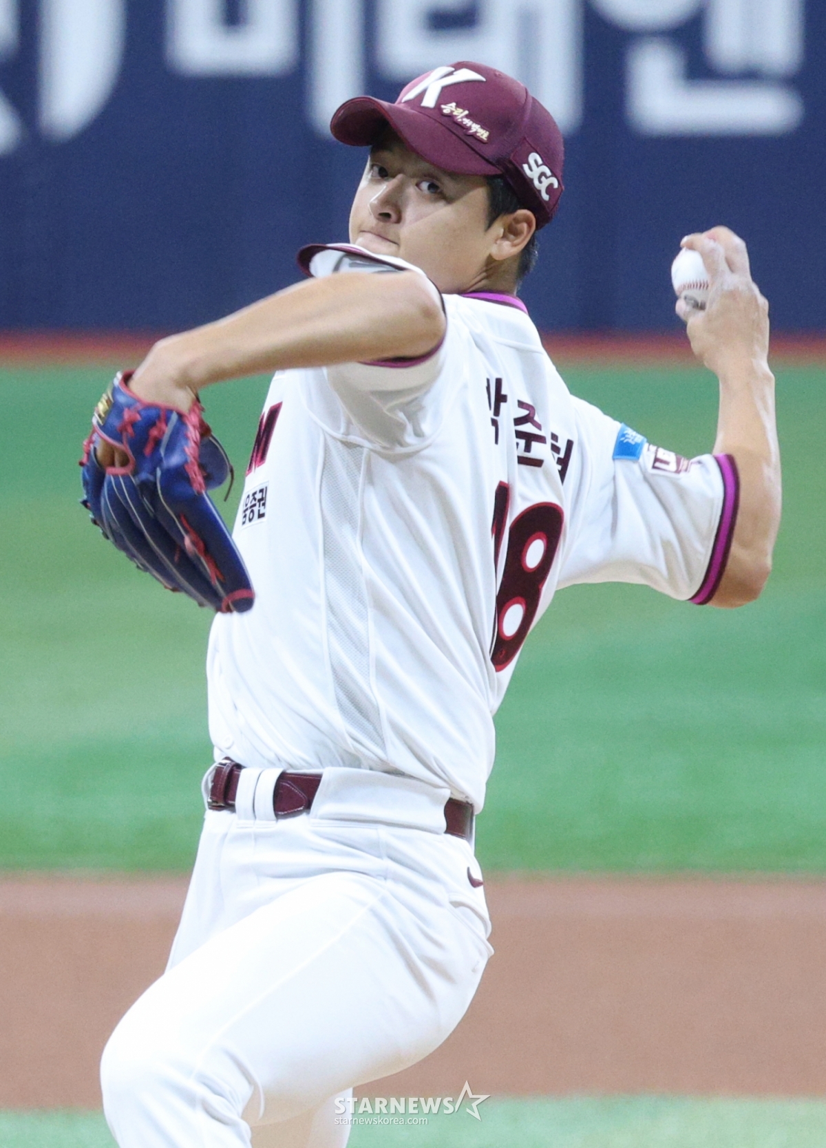 Kiwoom队的首发投手朴俊贤正在奋力拼搏。