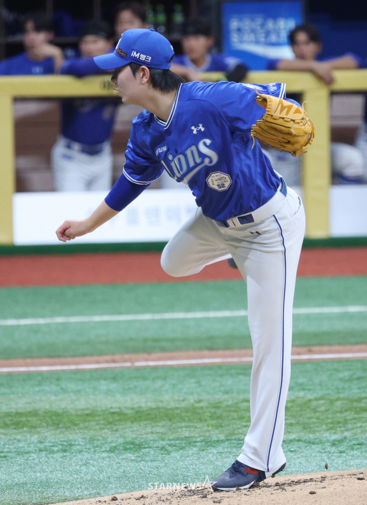 图为三星队的首发投手张灿熙正在奋力拼搏。