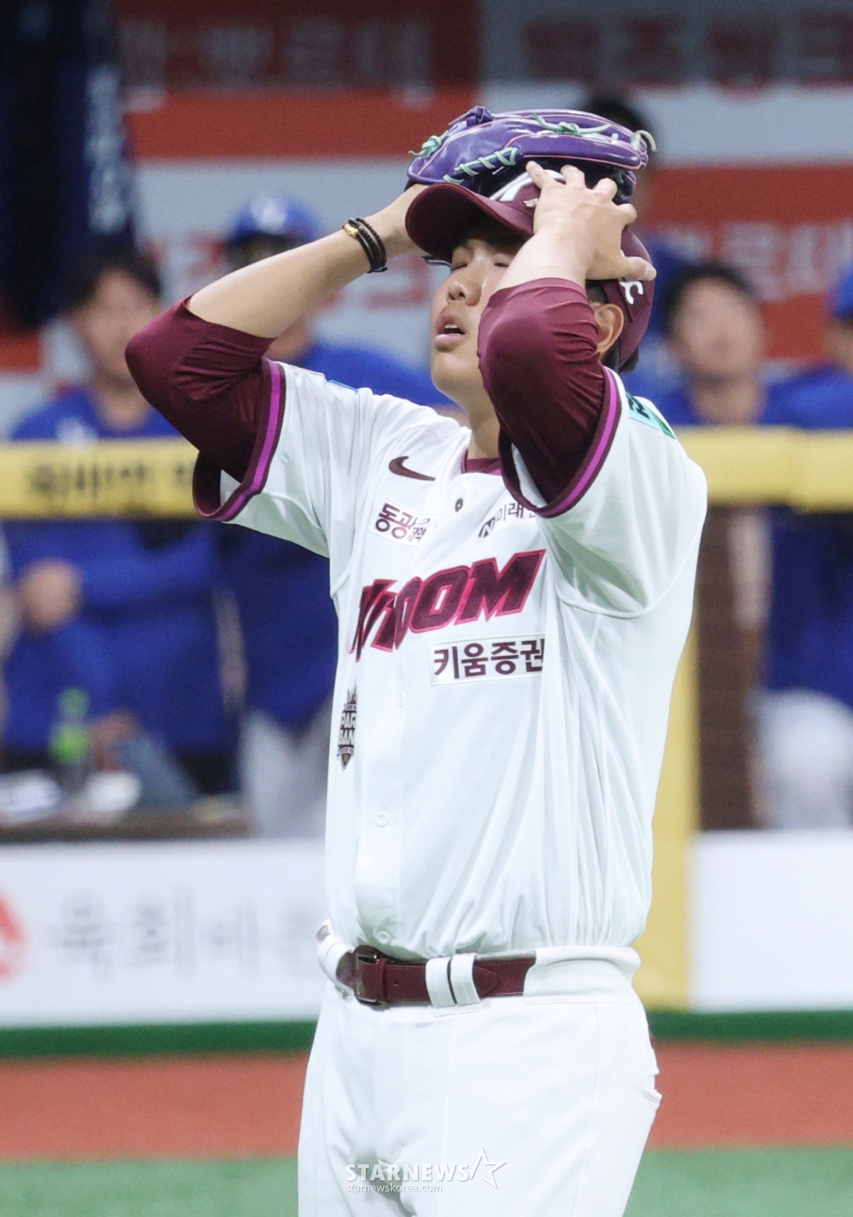 Kiwoom朴正勋在第8回合初度过失分危机,结束局后激动地走向球员席。