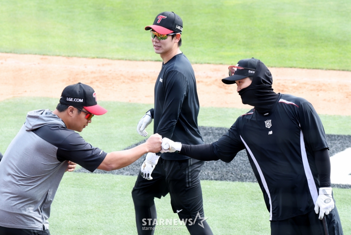28日,KT分配队在水原KT Wizpark举行的2026KBO联赛LG Twins和KT Wiz比赛之前结束训练,正在与洪昌基、文宝京打招呼。 2026.04.28.