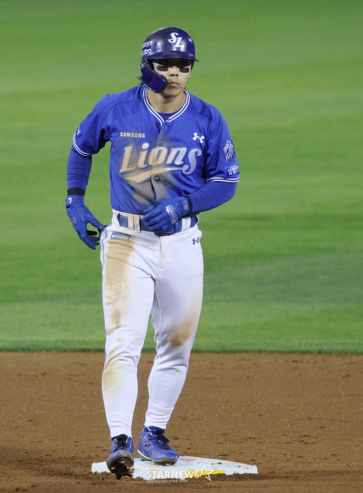 图为,三星队的金成润在第5回合初在2人出局1人在垒的情况下,击出1打点适时2垒打,出垒后正在调整呼吸。