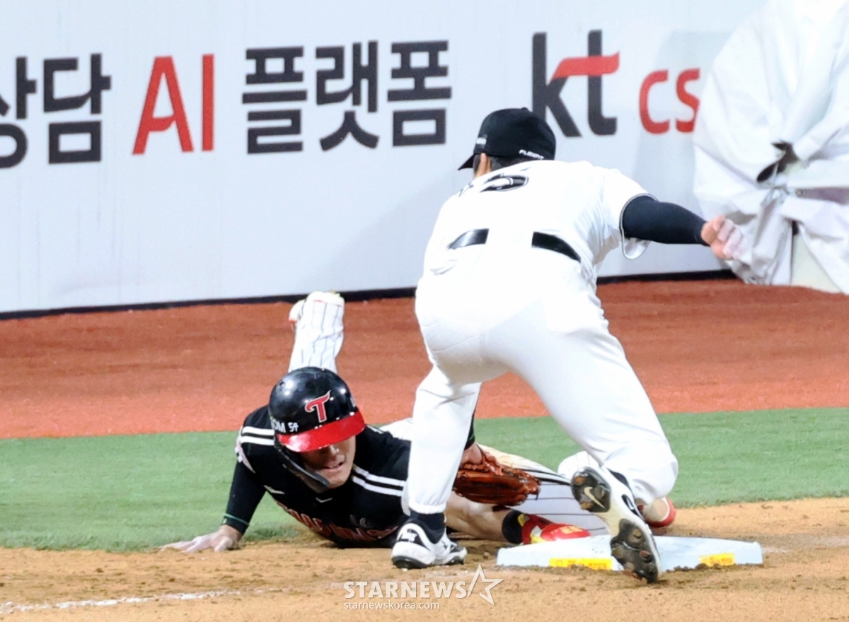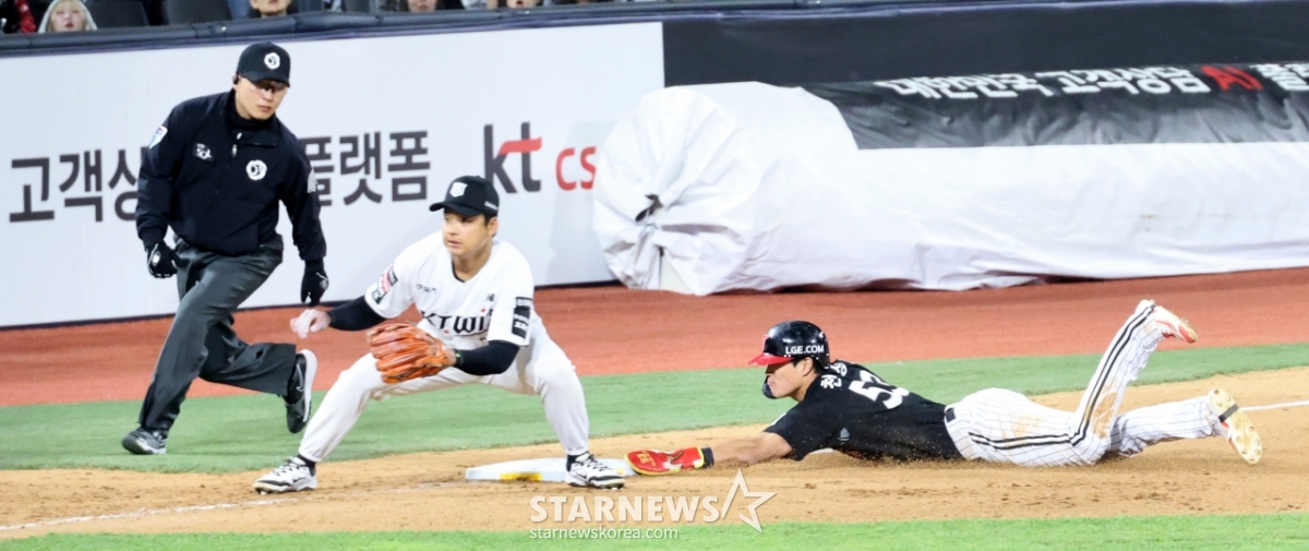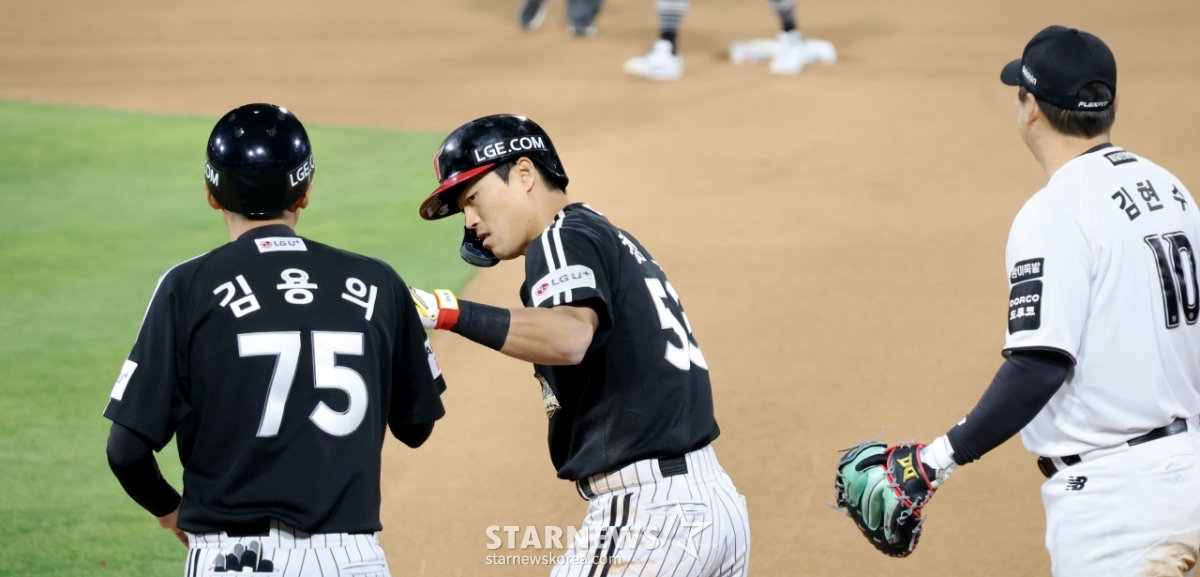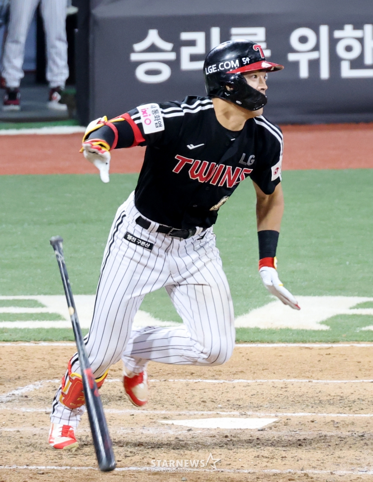 LG队2号击球手千成浩面对老东家表现活跃。 29日,在水原KT Wizpark举行的2026KBO联赛LG双子队与KT Wiz队的比赛第10回合初,千成浩以3比3平局1人出局后安打出垒。