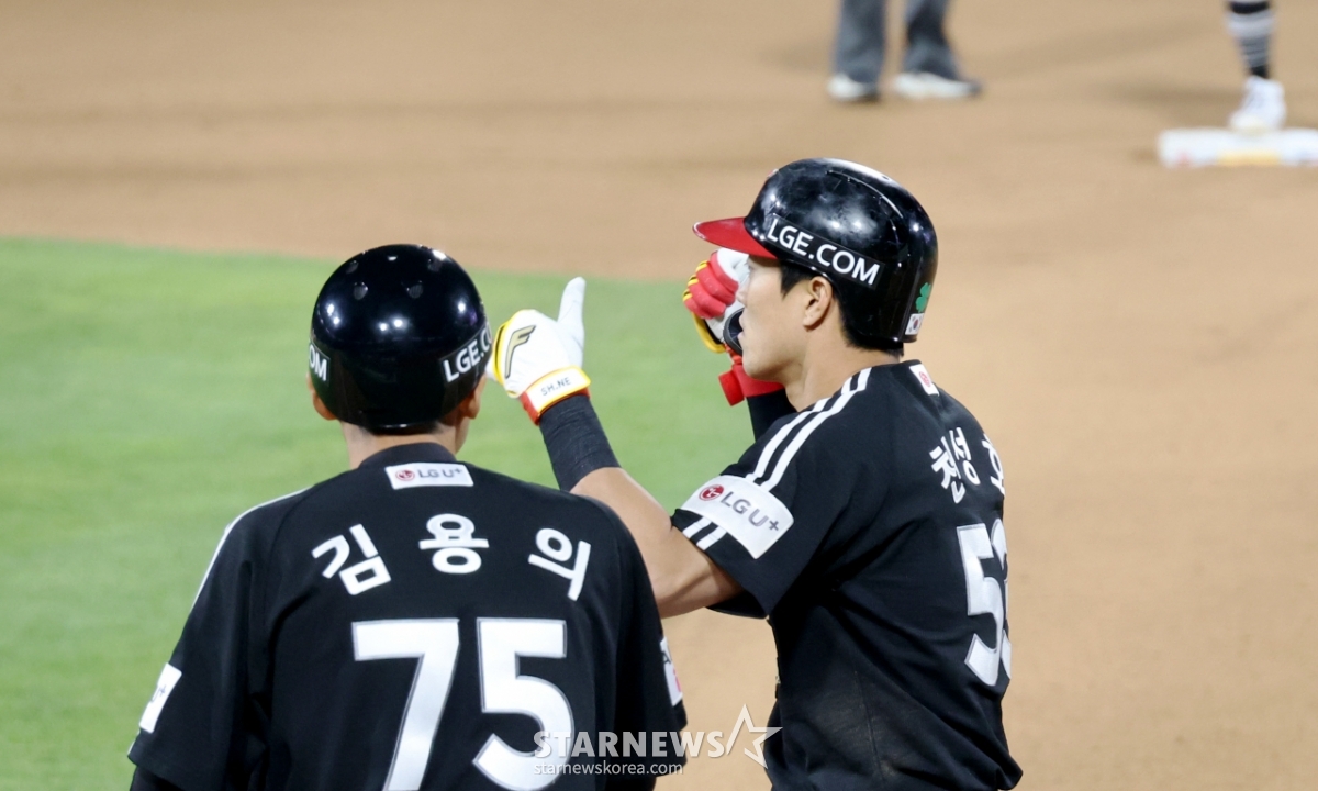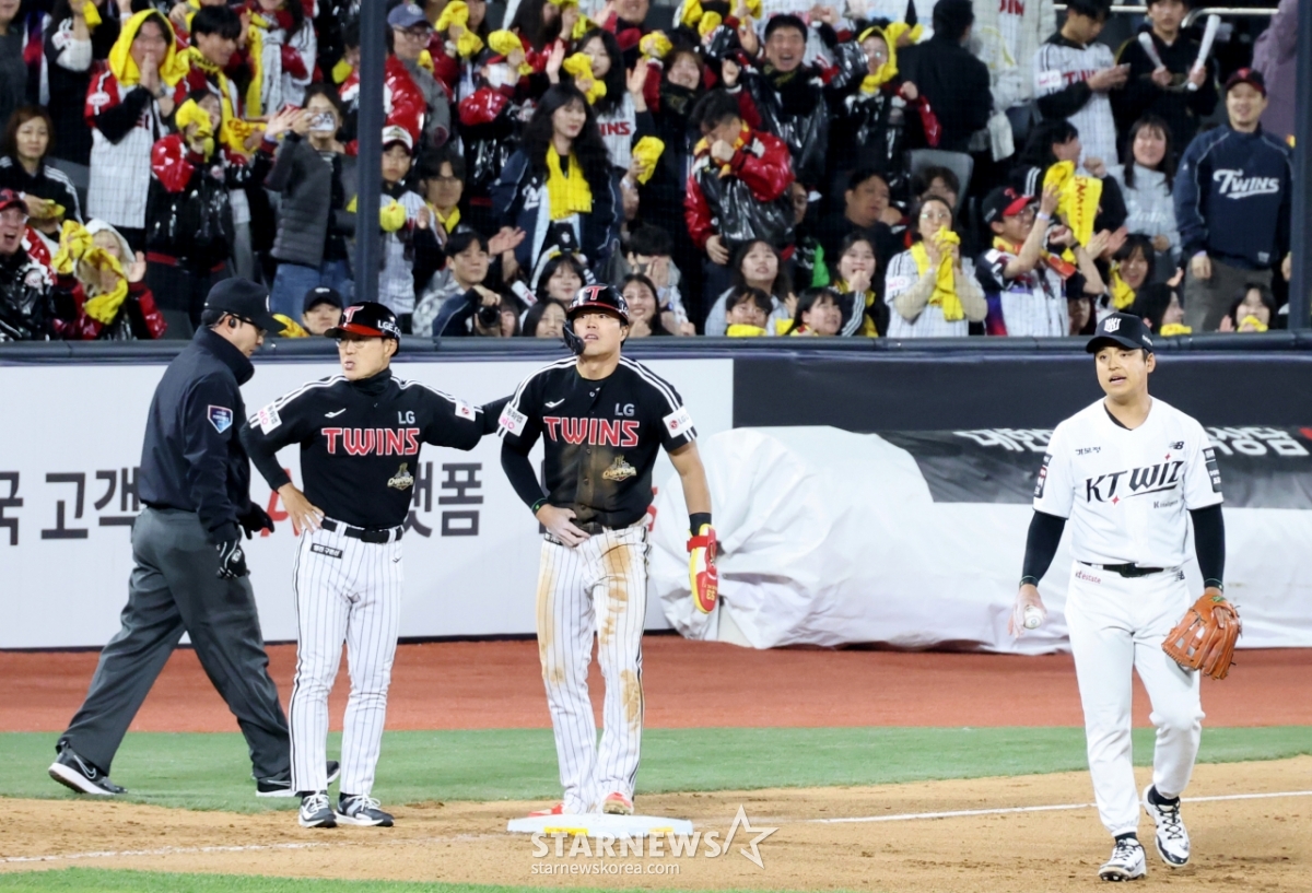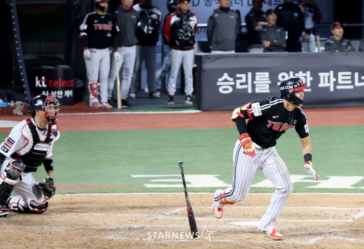 29日,在水原KT Wizpark举行的2026KBO联赛LG双子队与KT Wiz队的比赛第10回合初,LG队3比3平局1人出局3人在垒的情况下,以1打点安打出垒。 得分的千成浩。 2026.04.29.
