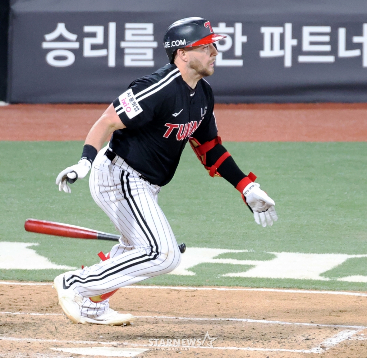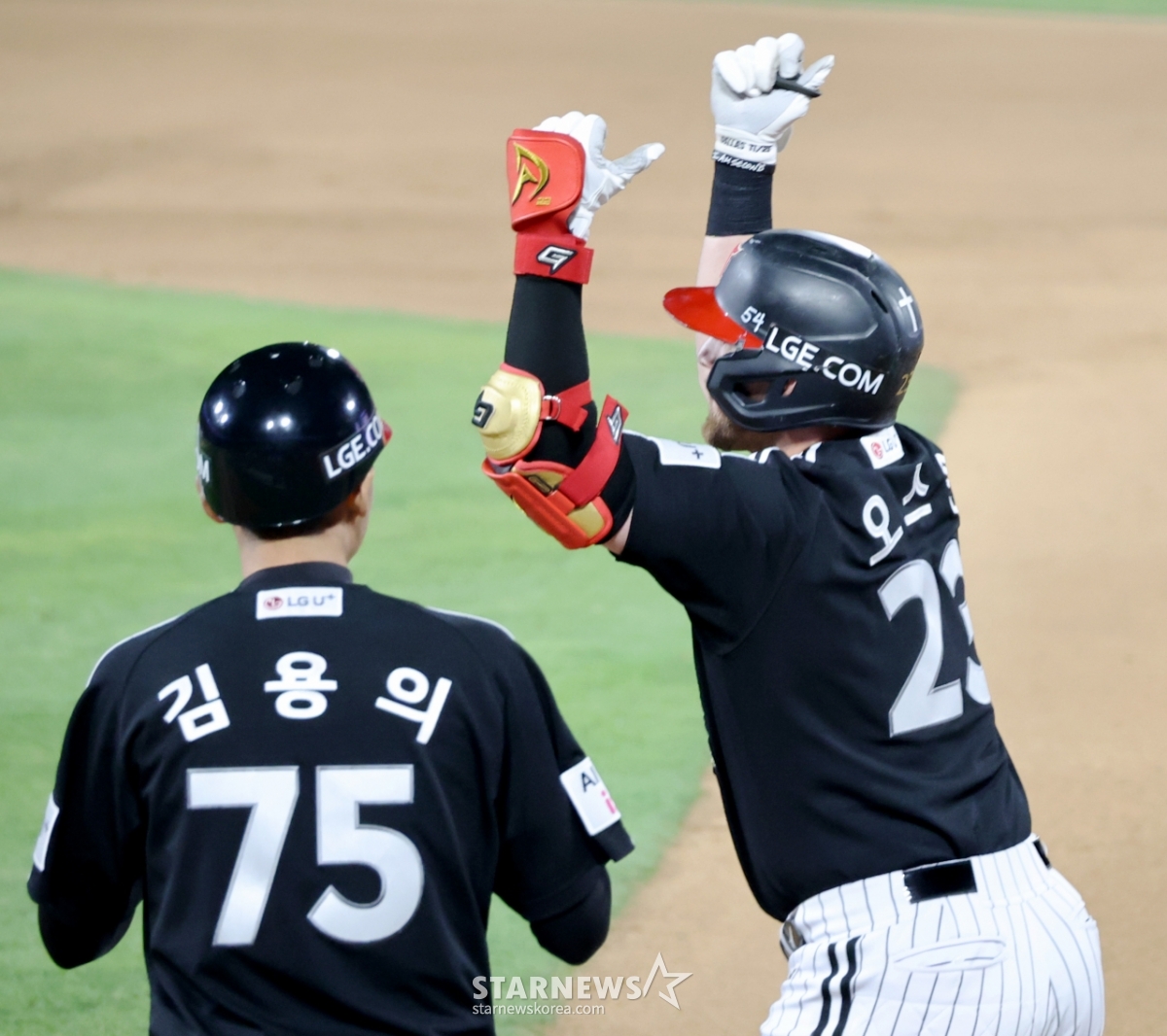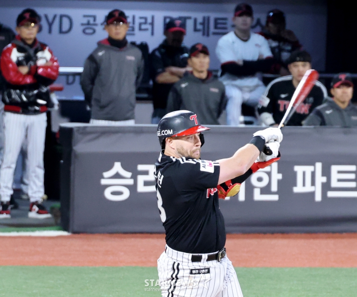 29日,在水原KT Wizpark举行的2026KBO联赛LG双子队与KT Wiz队的比赛第10回合初,LG队3比3平局1人出局3人在垒的情况下,以1打点安打出垒。 2026.04.29.