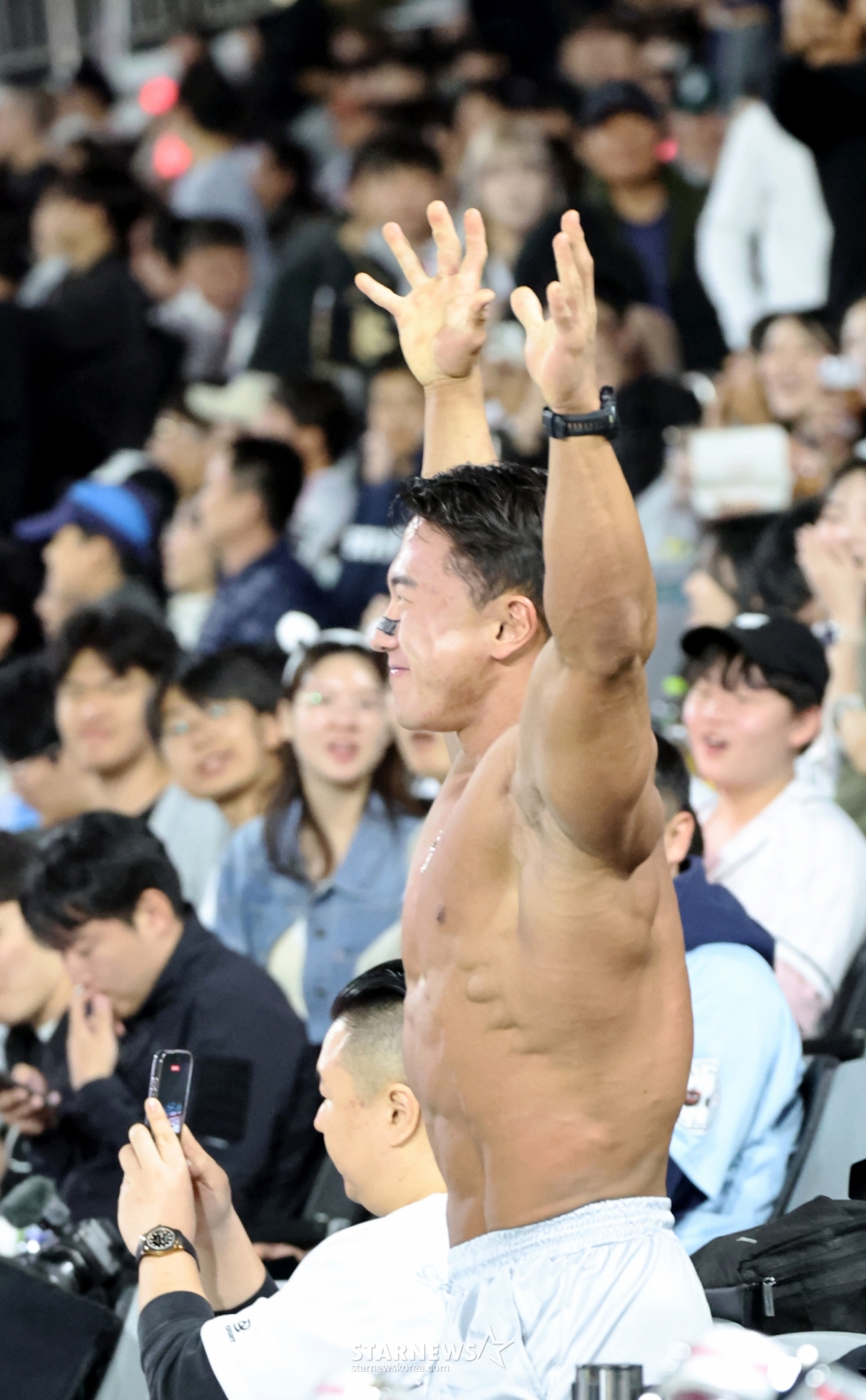 30日,在水原KT Wizpark举行的2026KBO联赛LG双子队与KT Wizpark队的比赛第5回合末,KT队扳平比分后,开球的健美运动员朴在勋(音)在局结束后脱掉上衣,展示了自己的身体。 2026.04.30