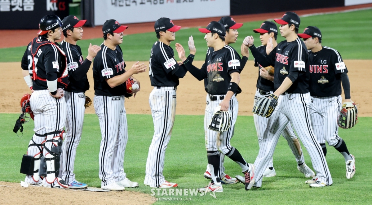 30日,在水原KT Wizpark举行的2026KBO联赛LG双子队和KT Wiz队的比赛第9回合末,LG队的终场投手咸德洙和选手们正在庆祝。 2026.04.30
