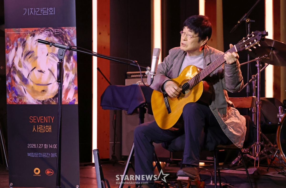 歌手金昌完27日下午在首尔钟路区Panta Carage举行的单曲《Seventy》发行记者见面会上给出席者送上了歌曲礼物。