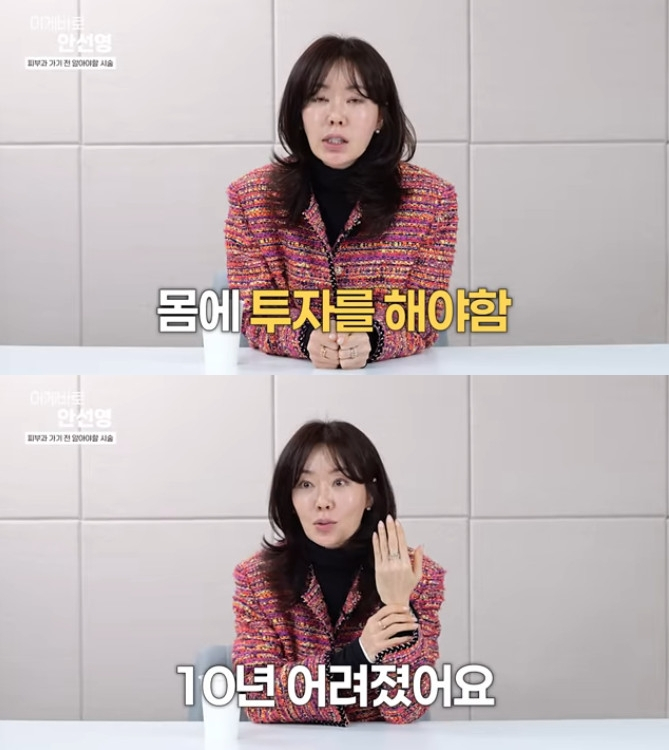 安善英说:"最近不是留在脸上,而是应该放一些消失的东西,应该注射刺激胶原蛋白再生的针,虽然脸也那样,但也放在手上","结果手年轻了10年。 也管理好给别人看的手。"