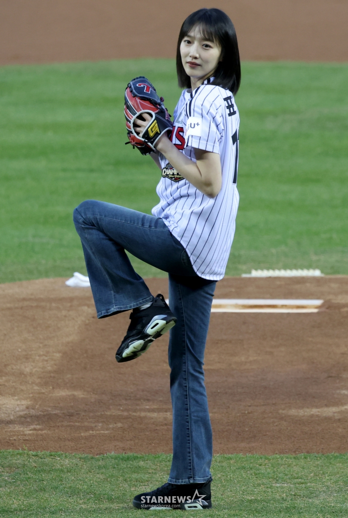 图为演员表艺珍正在为LG胜利祈愿开球。 击球手由张赫镇负责。